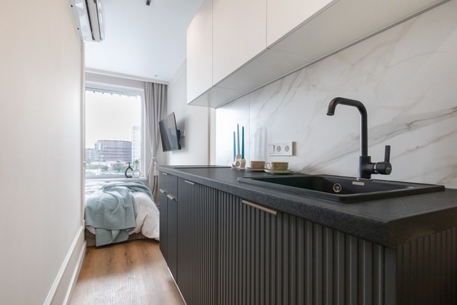 Стильная уютная студия в ЖК «Мята». Большие окна. Качественная дорогая мебель и техника. Интерьер продуман до мелочей. Апартаменты, откуда не хочется уезжать. Метро «Хорошевская» (10 минут пешком).