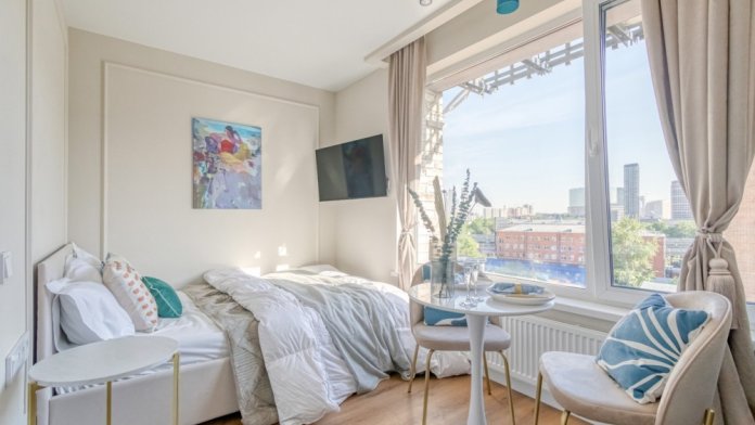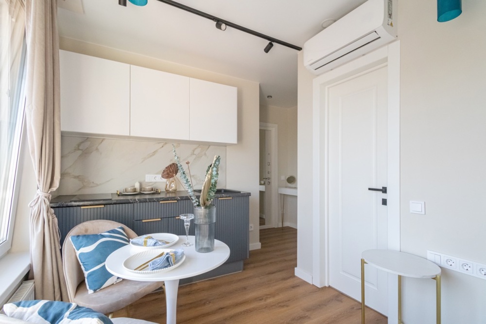 Стильная уютная студия в ЖК «Мята». Большие окна. Качественная дорогая мебель и техника. Интерьер продуман до мелочей. Апартаменты, откуда не хочется уезжать. Метро «Хорошевская» (10 минут пешком).