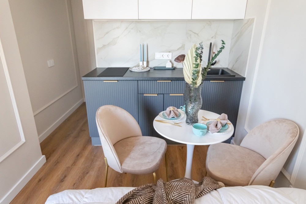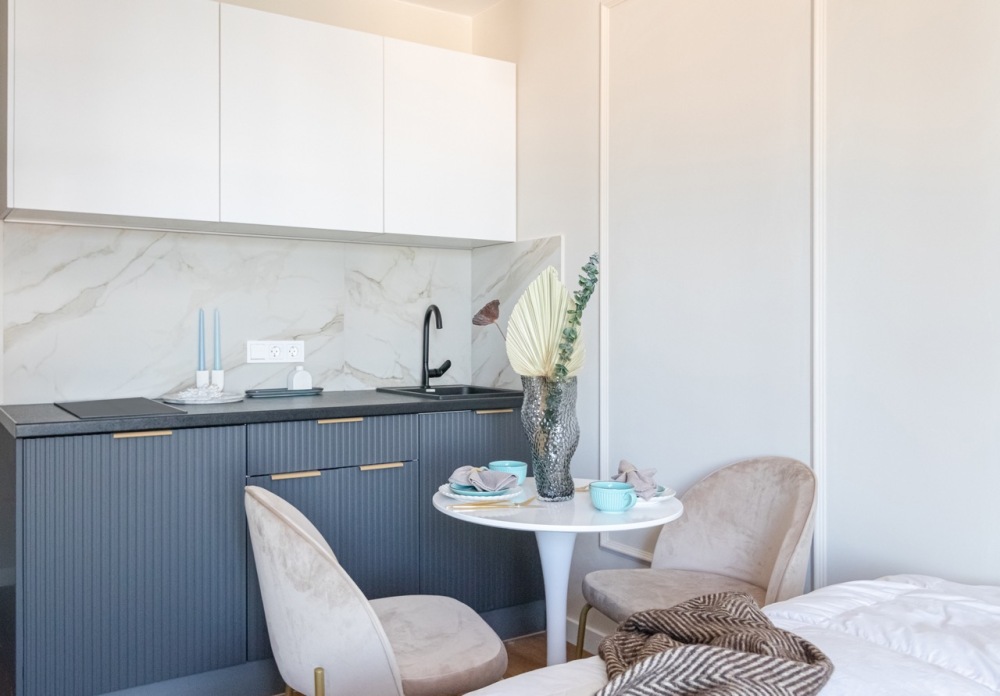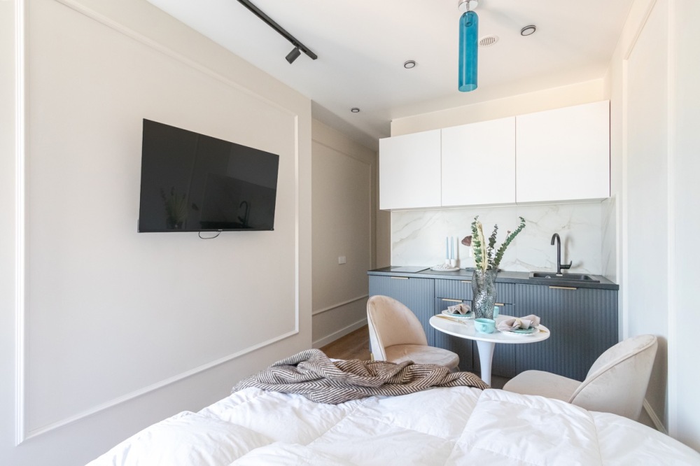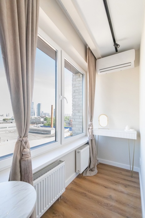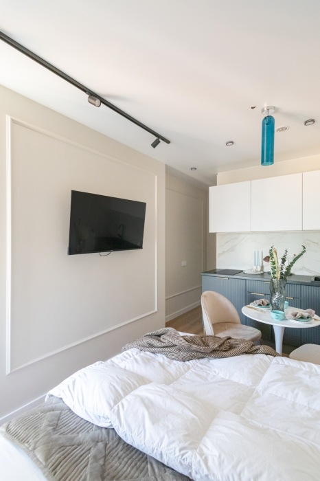 Стильная уютная студия в ЖК «Мята». Большие окна. Качественная дорогая мебель и техника. Интерьер продуман до мелочей. Апартаменты, откуда не хочется уезжать. Метро «Хорошевская» (10 минут пешком).