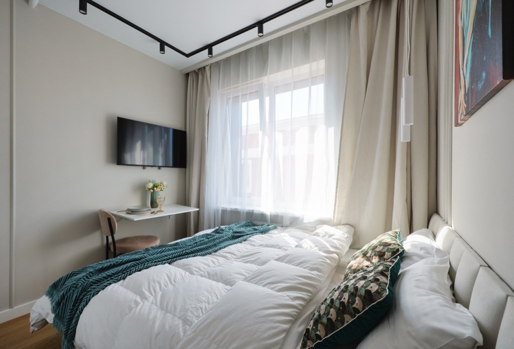 Большие окна. Качественная дорогая мебель и техника. Интерьер продуман до мелочей. Апартаменты, откуда не хочется уезжать.