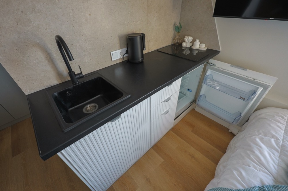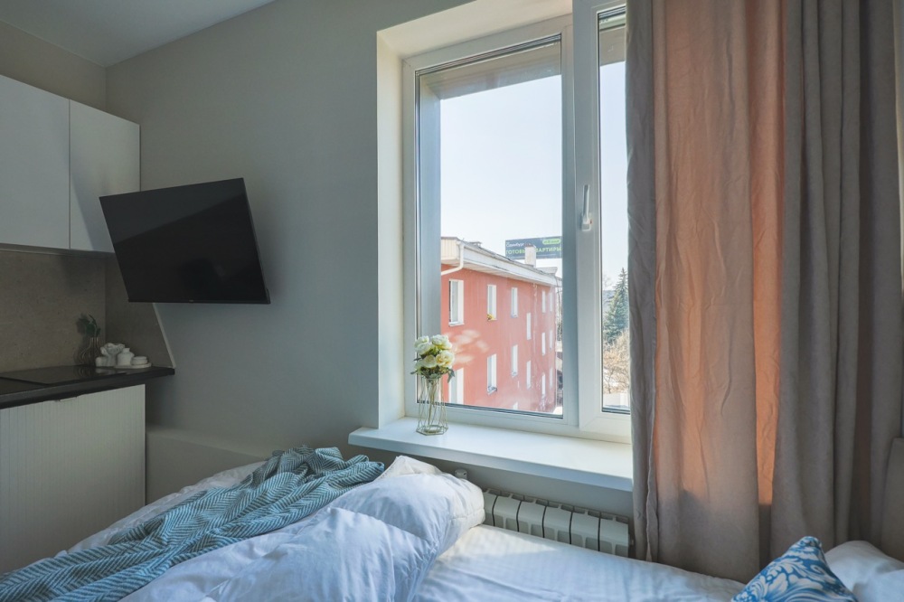 Большие окна. Качественная дорогая мебель и техника. Интерьер продуман до мелочей. Апартаменты, откуда не хочется уезжать.