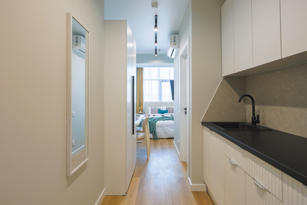 Большие окна. Качественная дорогая мебель и техника. Интерьер продуман до мелочей. Апартаменты, откуда не хочется уезжать.
