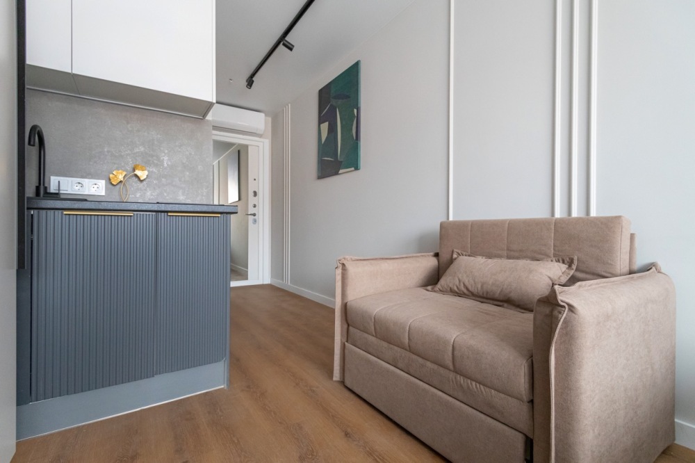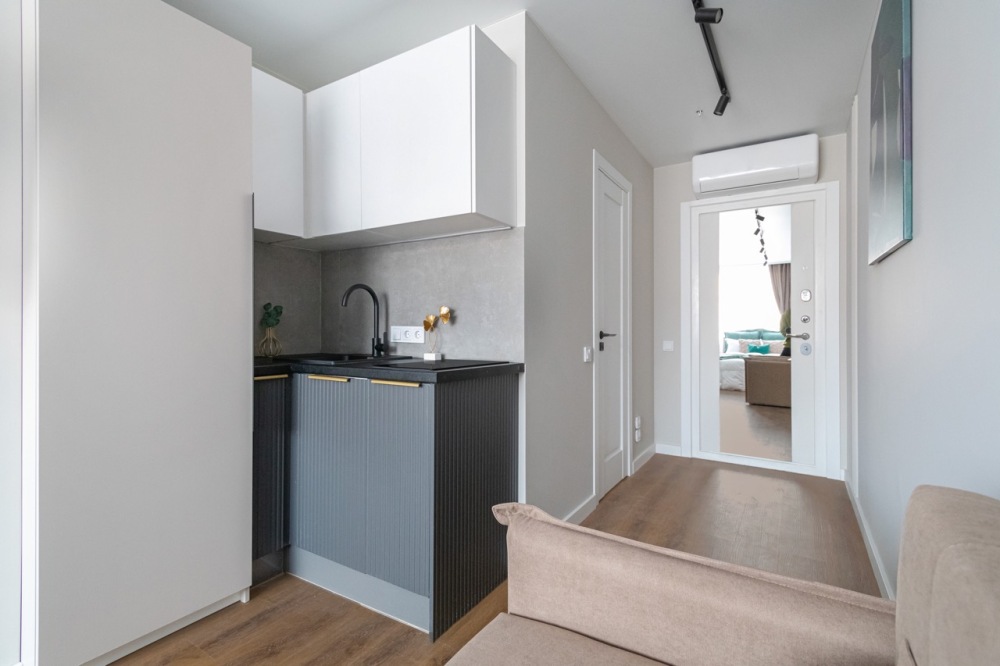 Стильная уютная студия в ЖК «Мята». Большие окна. Качественная дорогая мебель и техника. Интерьер продуман до мелочей. Апартаменты, откуда не хочется уезжать. Метро «Хорошевская» (10 минут пешком).
