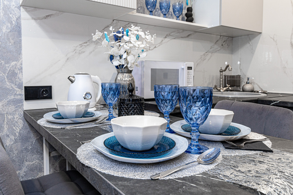 Полностью оборудованная кухня с профессиональной техникой и изысканной посудой.