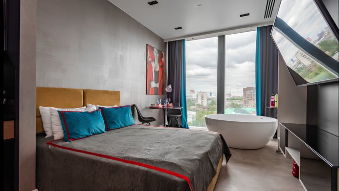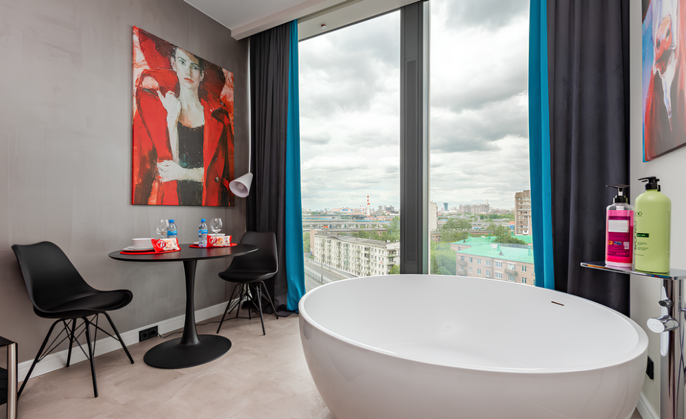 Изюминкой нашей уникальной студии является ванная - прямо в спальне вы сможете принять ванную и выпить чашечку кофе.