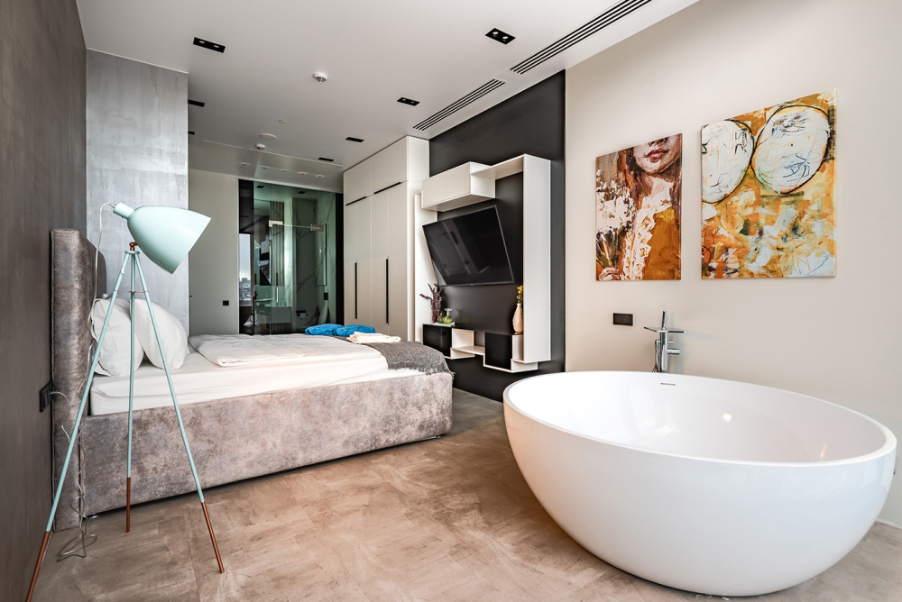 Изюминкой нашей уникальной студии является ванная - прямо в спальне вы сможете принять ванную и выпить чашечку кофе.