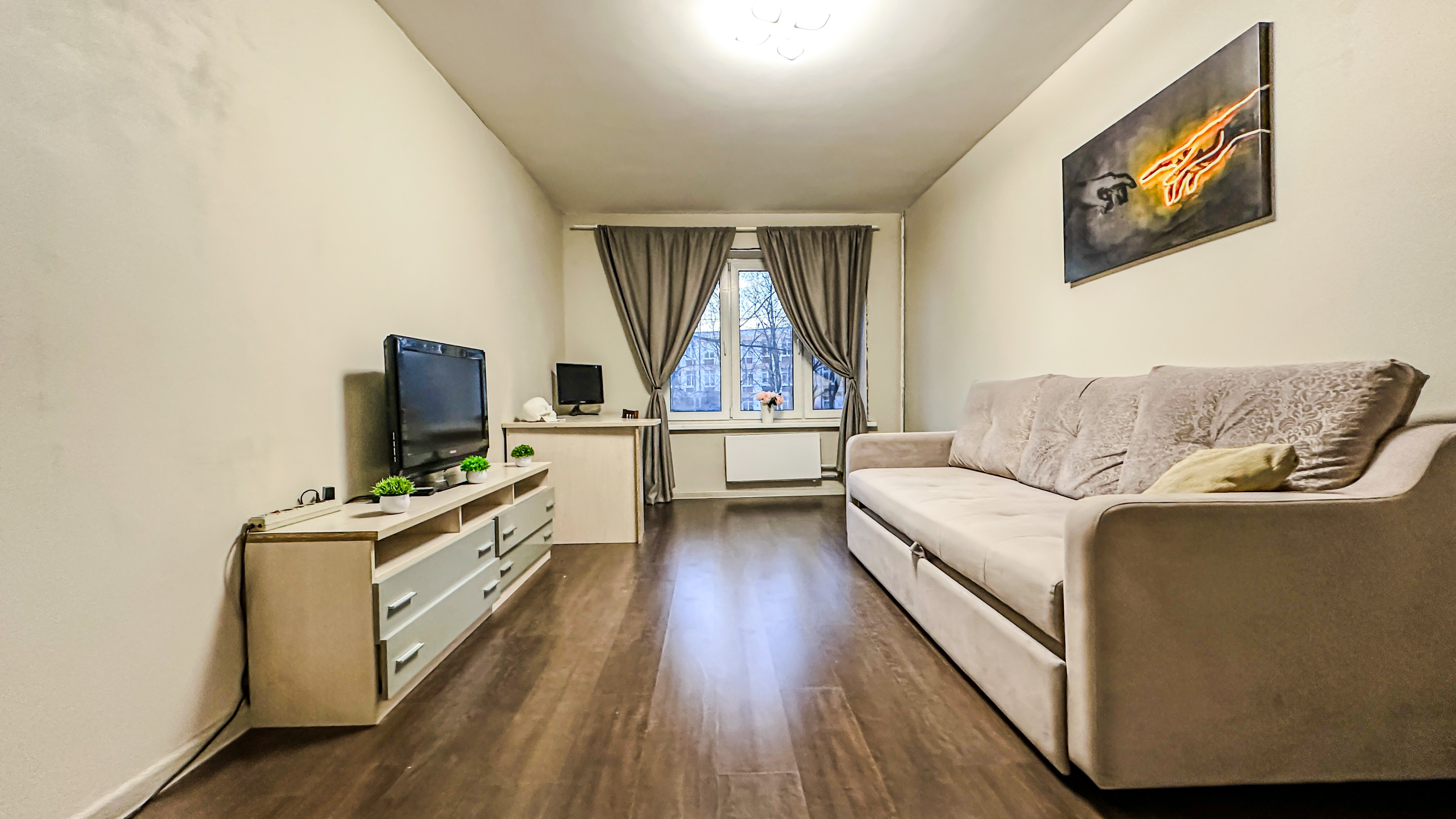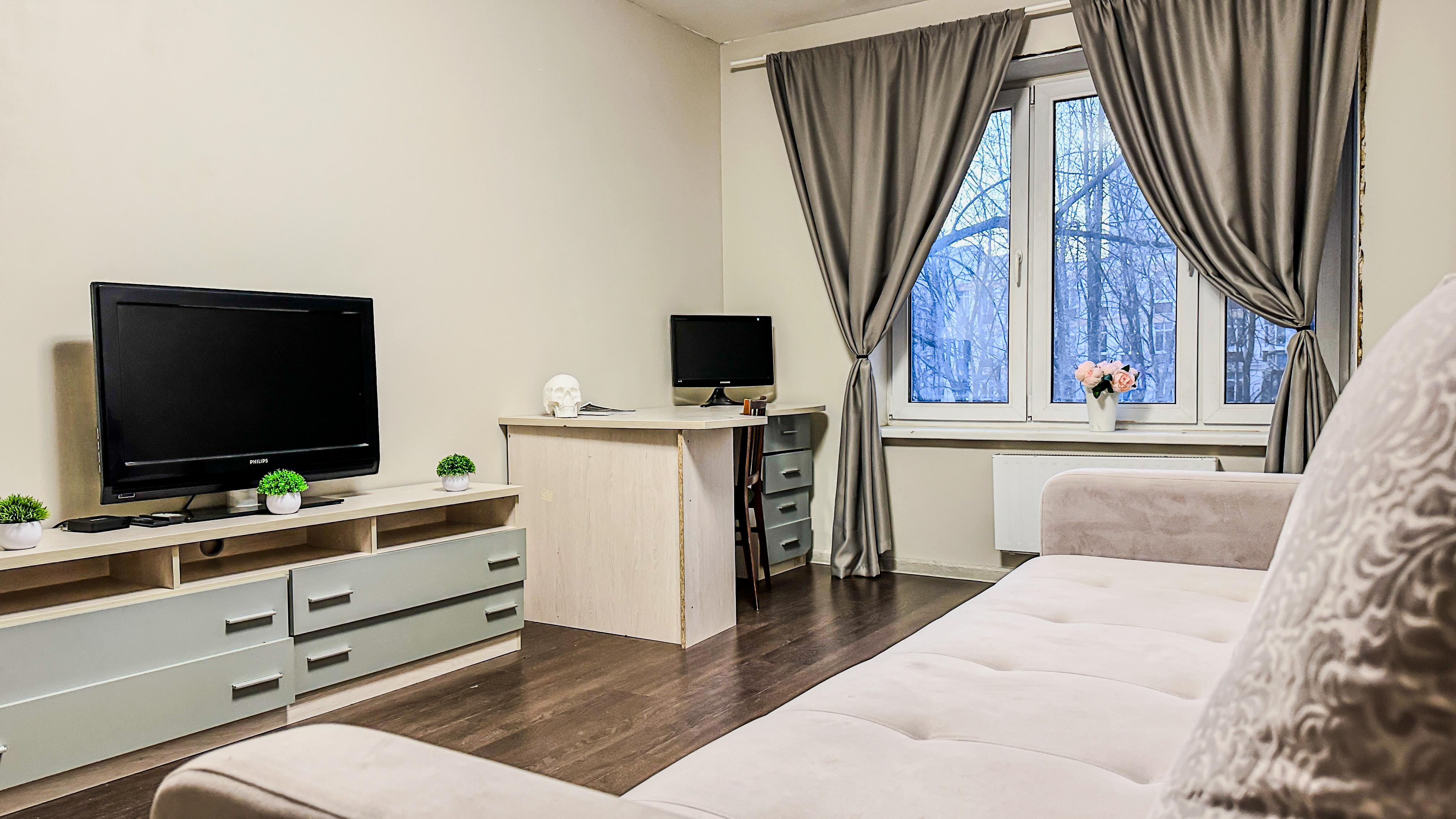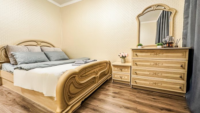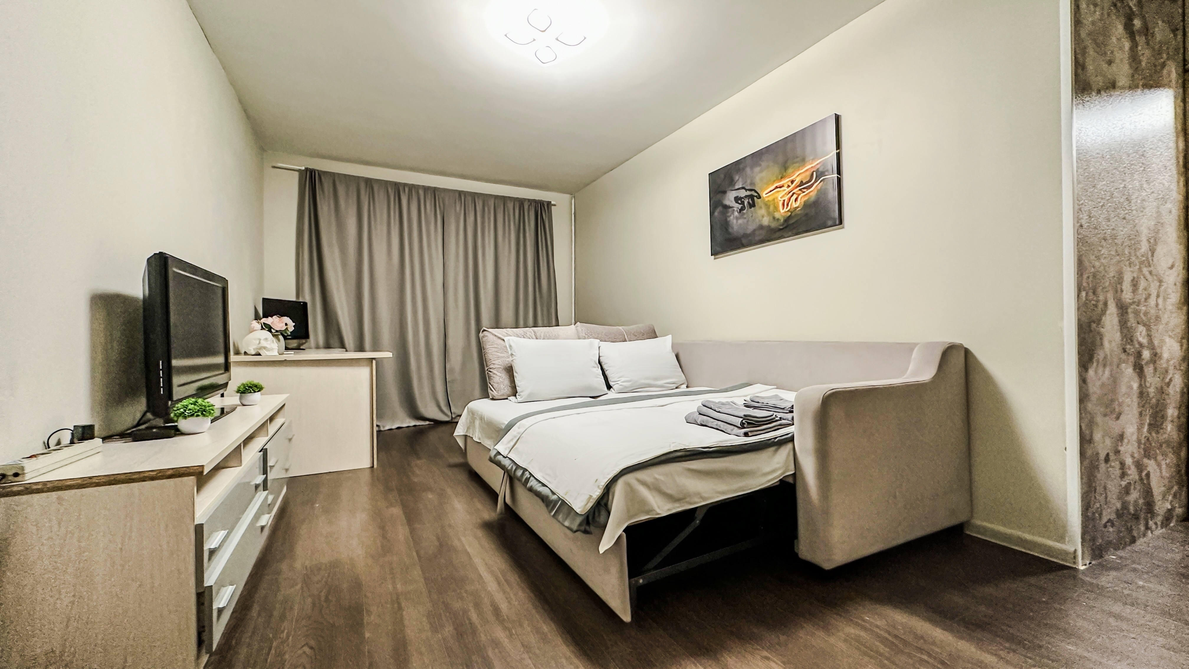 Удобства: двуспальная кровать, двуспальный диван, вместительный шкаф, сушилка для белья, фен, оборудованная кухня, холодильник, полный комплект посуды для приготовления и приёма еды, стиральная машина . После каждого выезда гостей проводим генеральную уборку.