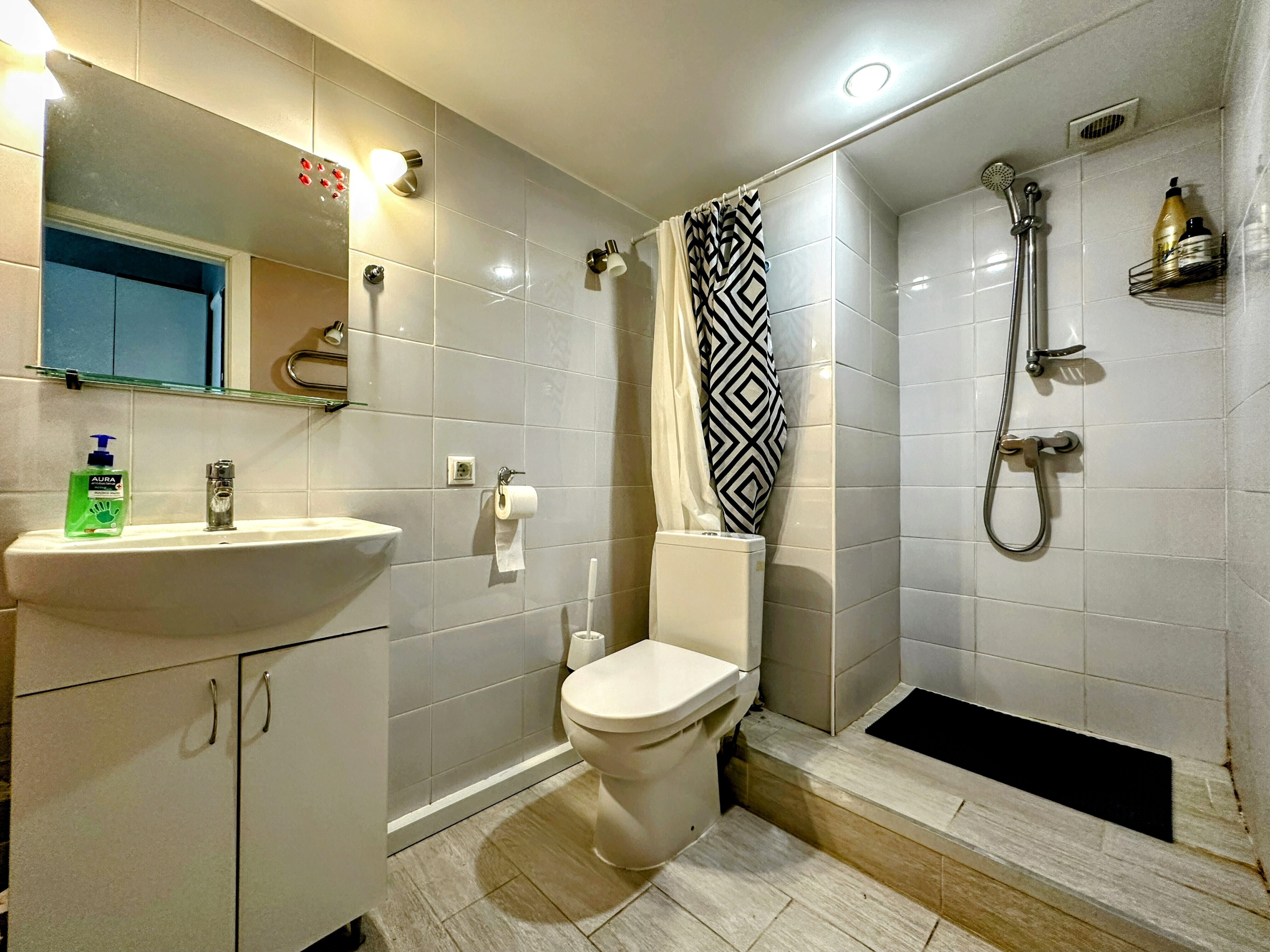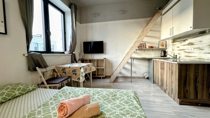Удобства: двухспальный диван, двуспальный ортопедический матрас на 2-ом ярусе, вместительный шкаф, сушилка для белья, фен, оборудованная кухня, холодильник, полный комплект посуды для приготовления и приёма еды, стиральная машина с сушкой. После каждого выезда гостей проводим генеральную уборку.