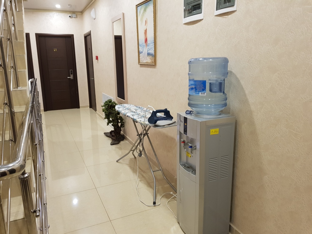 На каждом этаже имеется кулер с горячей и холодной водой, гладильная доска и утюг. Уборка в номере - 1 раз в 3 дня, смена белья - 1 раз в 5 дней.