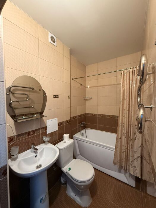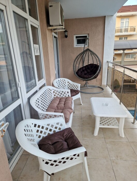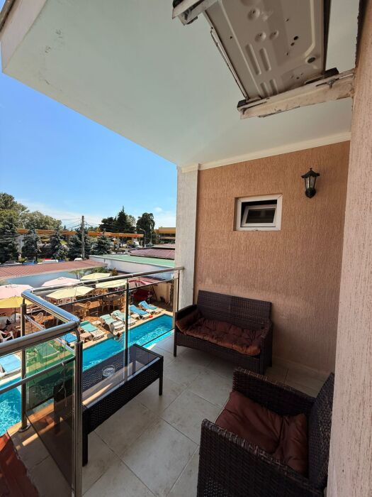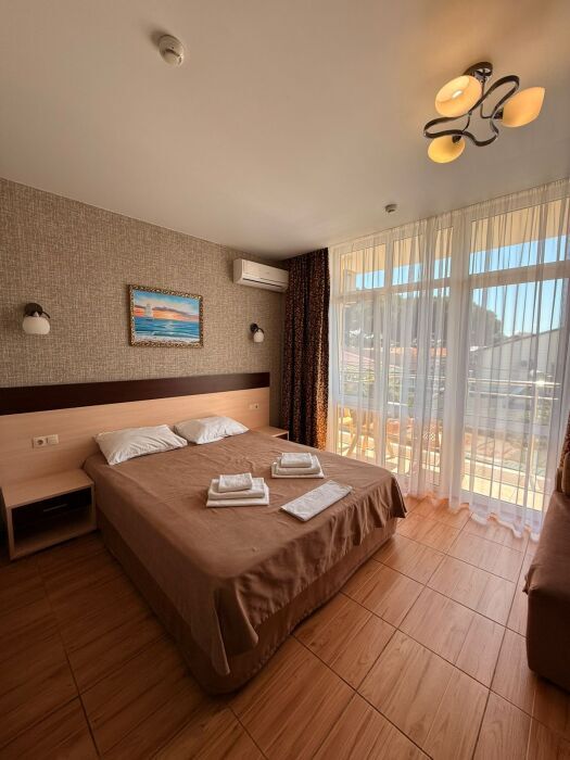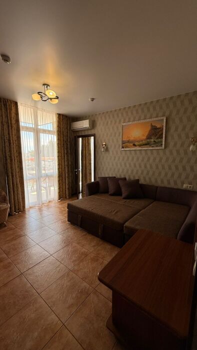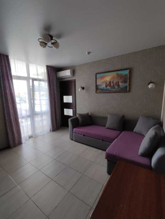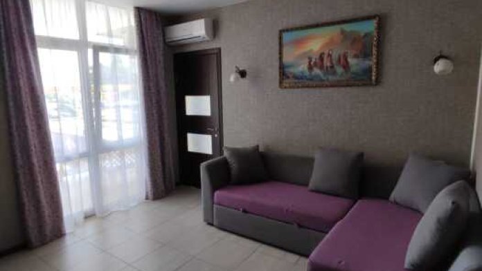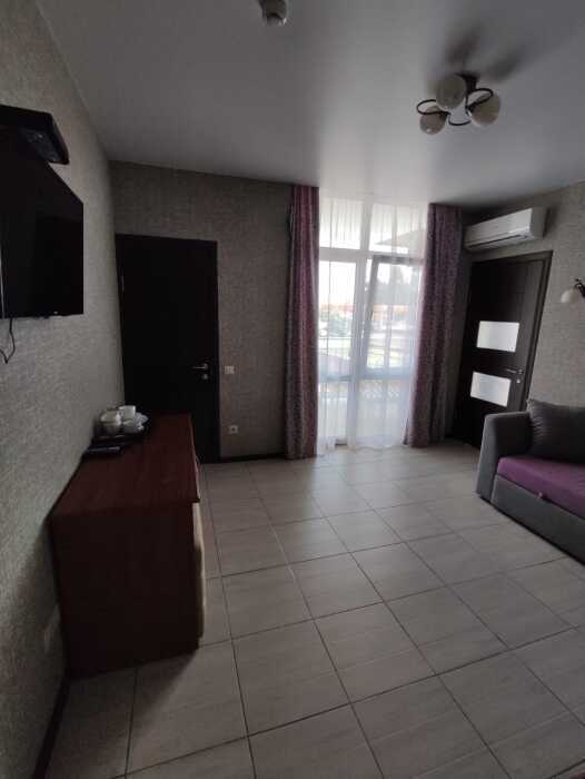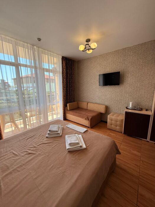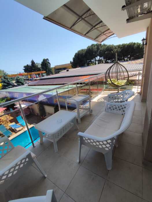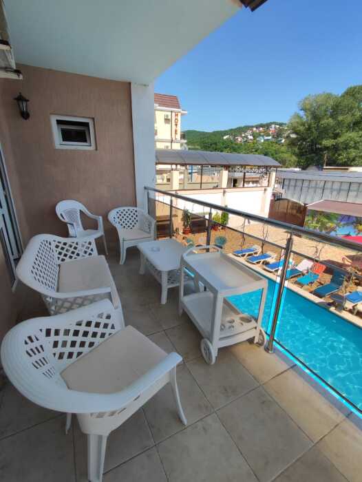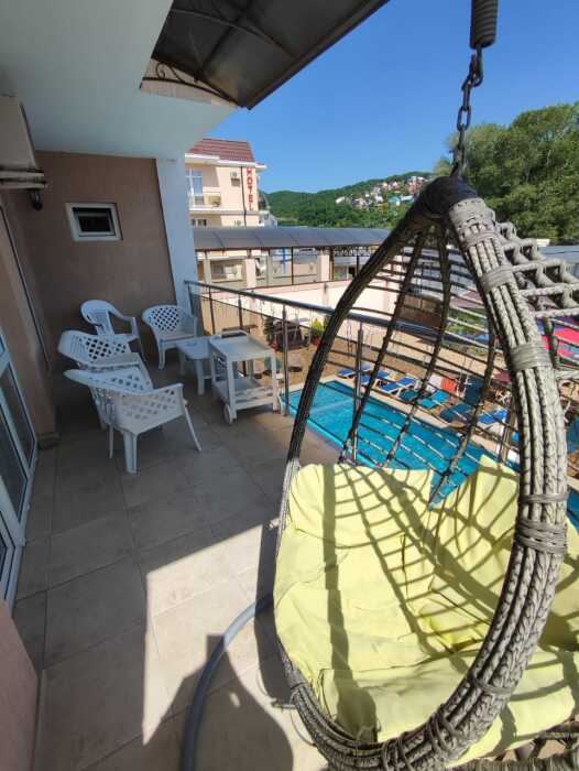 Номер состоит из гостиной и спальни. В гостиной расположен 2-местный раскладной диван (140*190), в спальне - двуспальная кровать (160*200). В номере: 2 телевизора жк (20 каналов), 2 сплит-системы, мини-холодильник, сейф, фен, набор посуды для чая и напитков, душ, туалет, балкон 15 кв. м с видом на бассейн, с сушилкой для белья, летней мебелью и качелей.