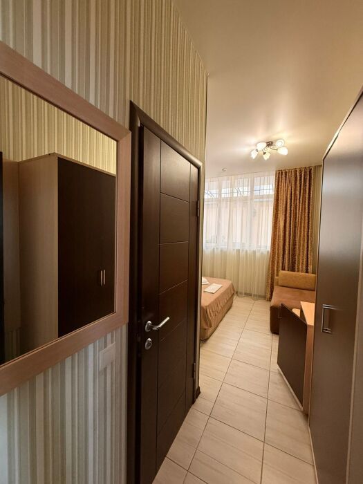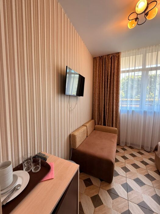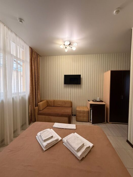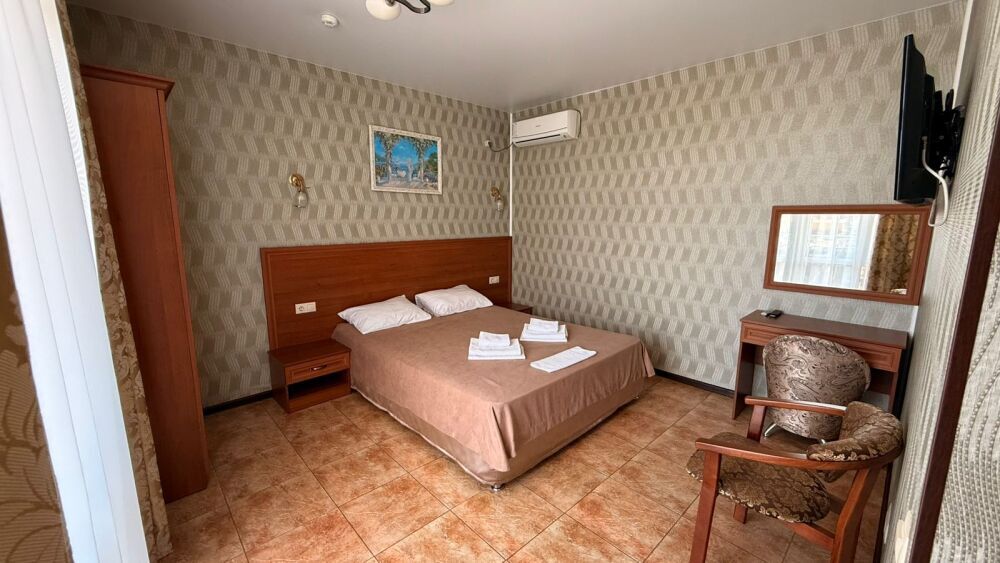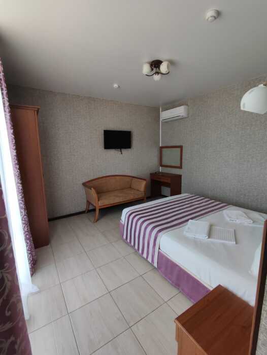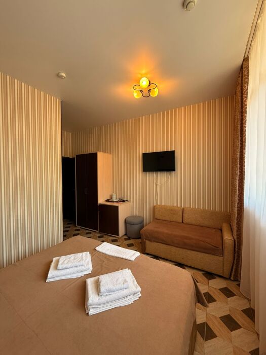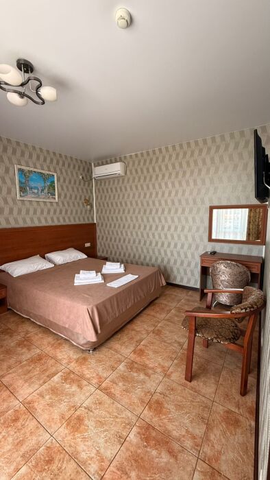 В номере 2 односпальные кровати (80*200 см) или двуспальная кровать (160*200 см) и дополнительное место - диванчик раскладной (70*190 см), телевизор жк (20 каналов), мини-холодильник, сплит-система, сейф, фен, душ (в некоторых номерах установлена ванна длиной 120 см), туалет, основной набор посуды.
