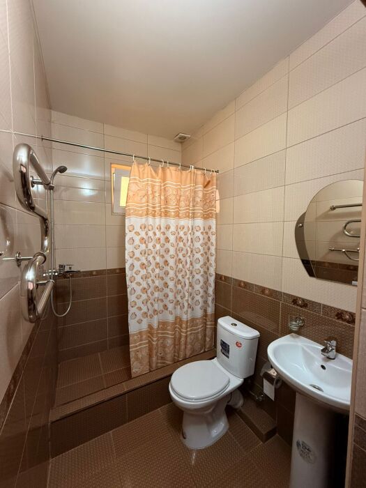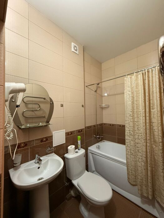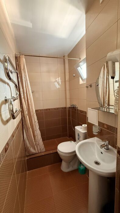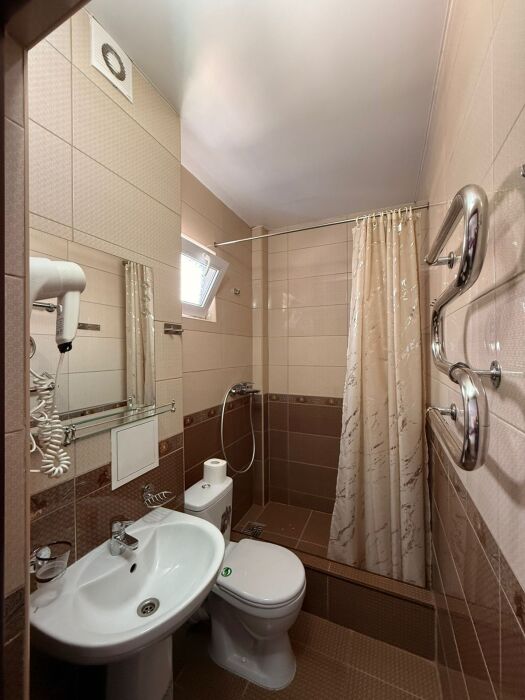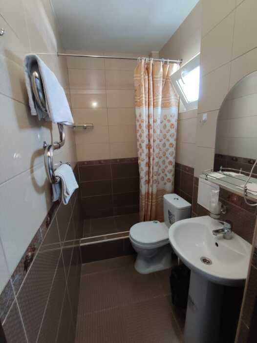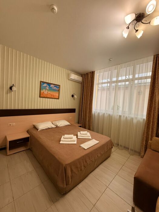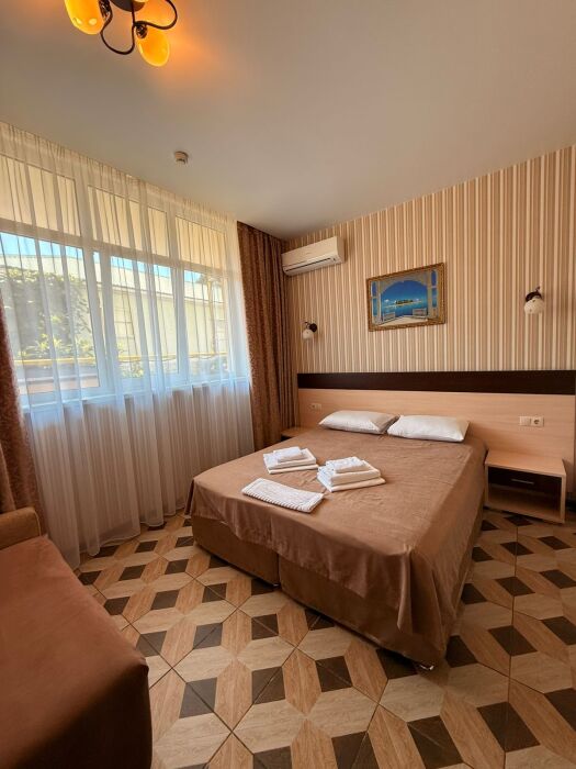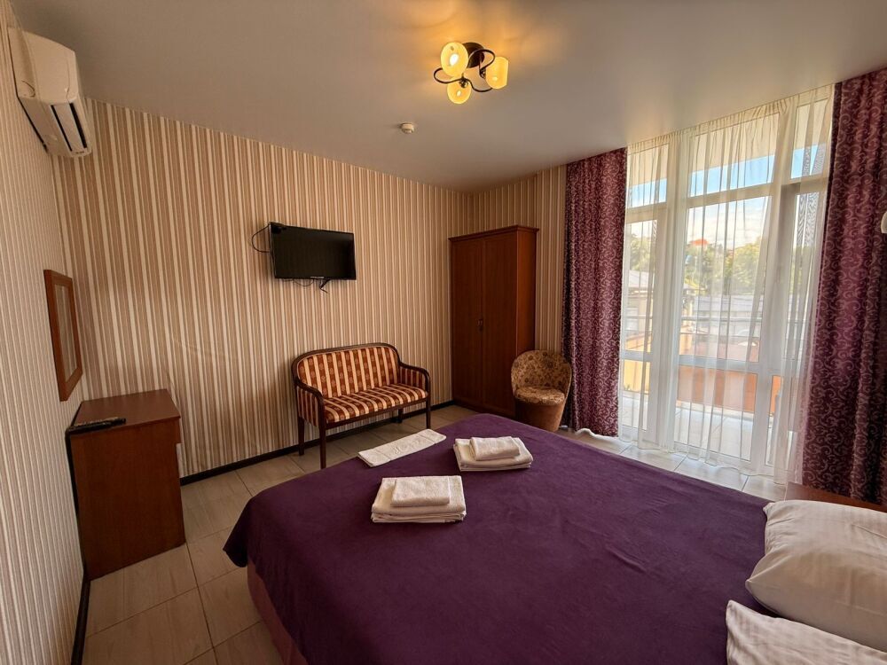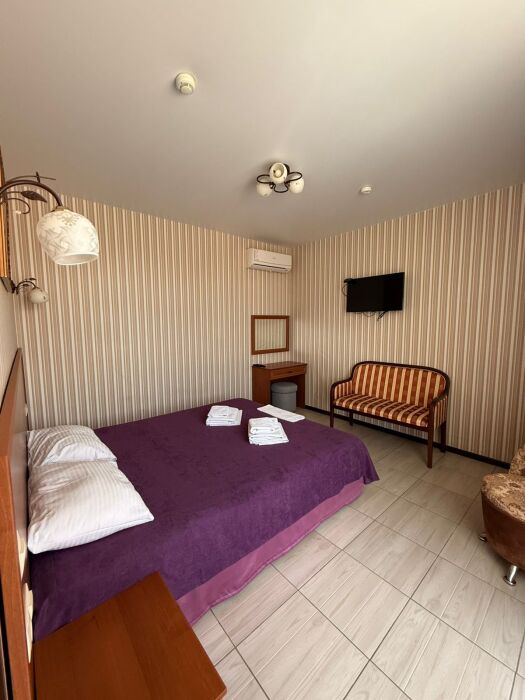 В номере: 2 односпальные кровати (80*200 см) или двуспальная кровать (160*200 см) и дополнительное место - диванчик раскладной (70*190), телевизор жк (20 каналов), мини-холодильник, сплит система, сейф, фен, душ (в некоторых номерах установлена ванна длиной 120 см), туалет, основной набор посуды.