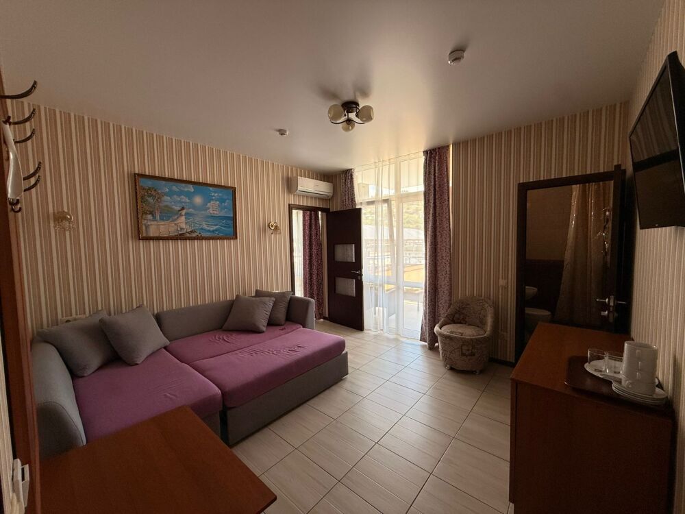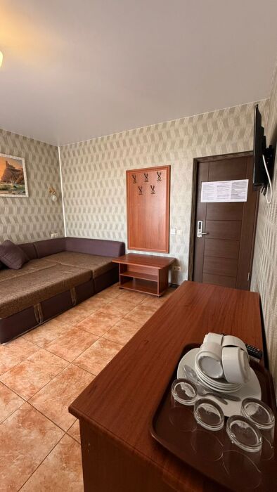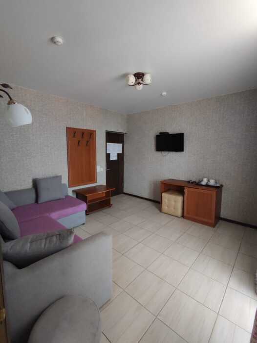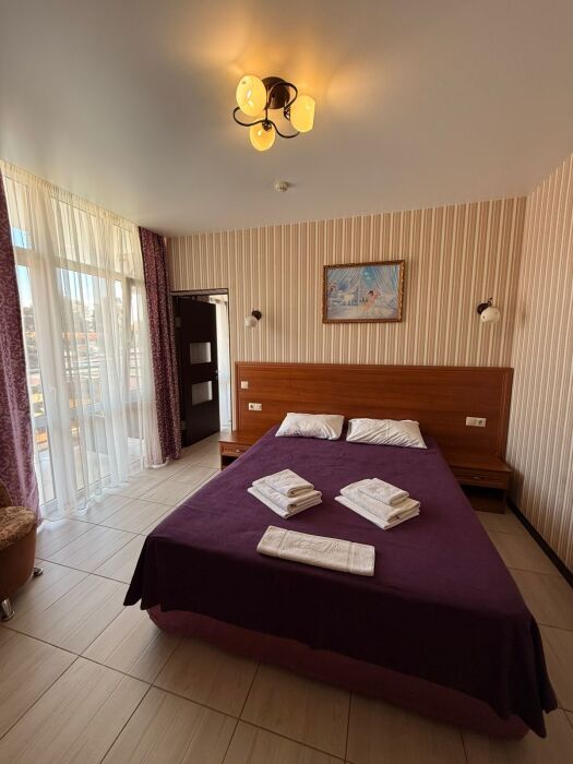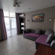 Номер состоит из гостиной и спальни. В гостнной расположен 2-местный раскладной диван (140*190), в спальне - двуспальная кровать (160*200). В номере: 2 телевизора жк (20 каналов), 2 сплит-системы, мини-холодильник, сейф, фен, набор посуды для чая и напитков, душ, туалет, балкон с сушилкой для белья и летней мебелью. Номера данной категории находятся на 2 и 3 этаже.