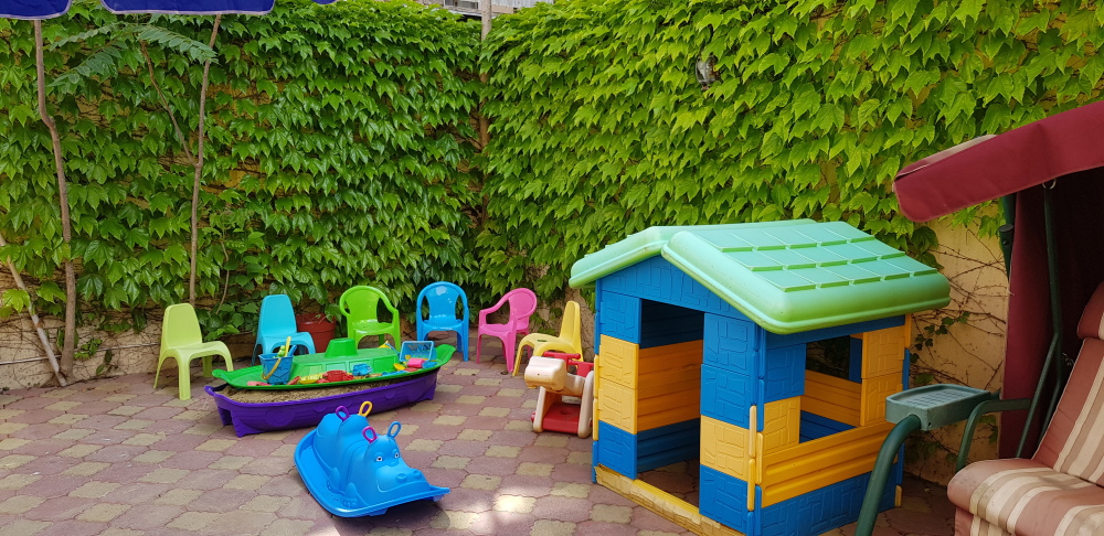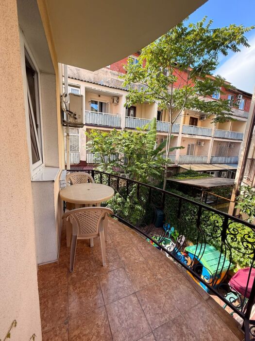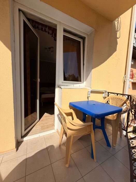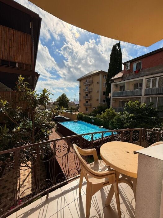 Балкон с сушилкой для белья и летней мебелью выходит в сторону ул. Лазарева с видом на бассейн и на море.