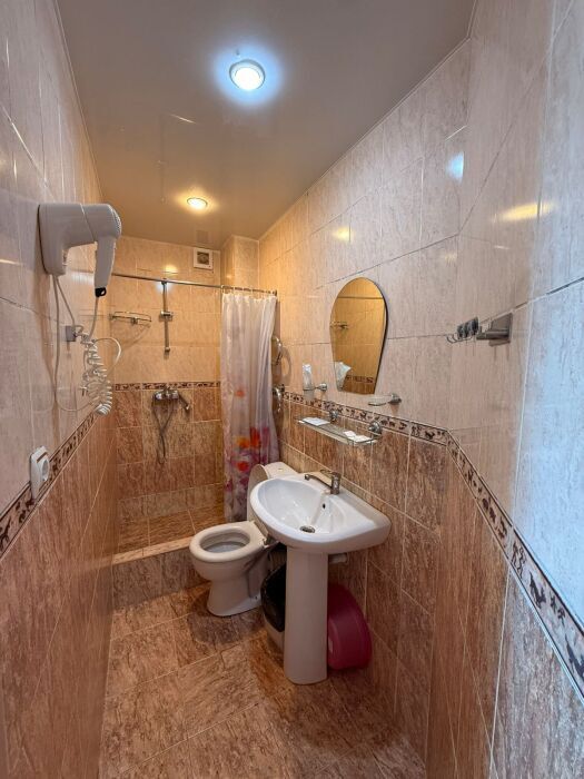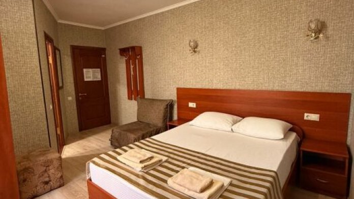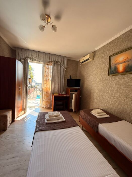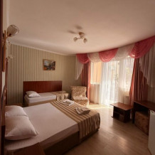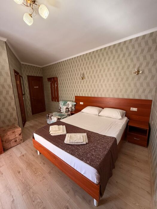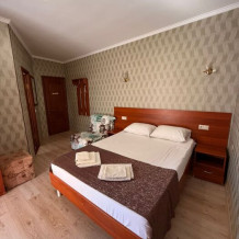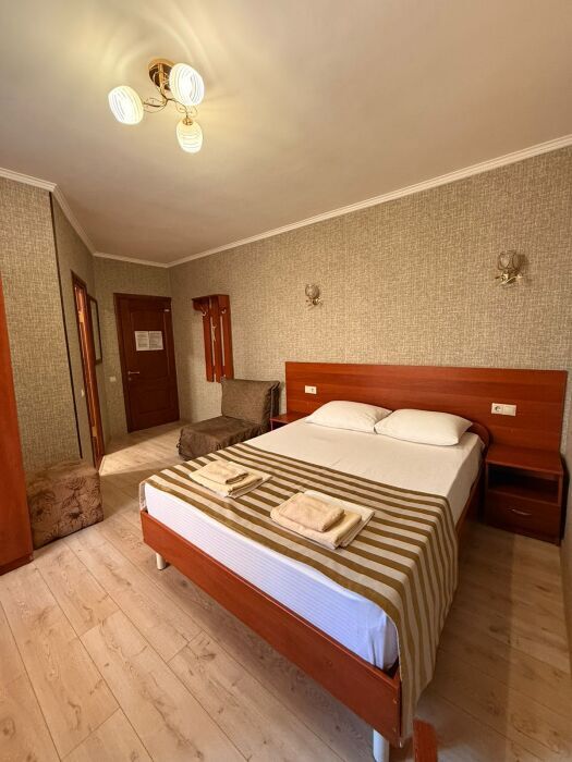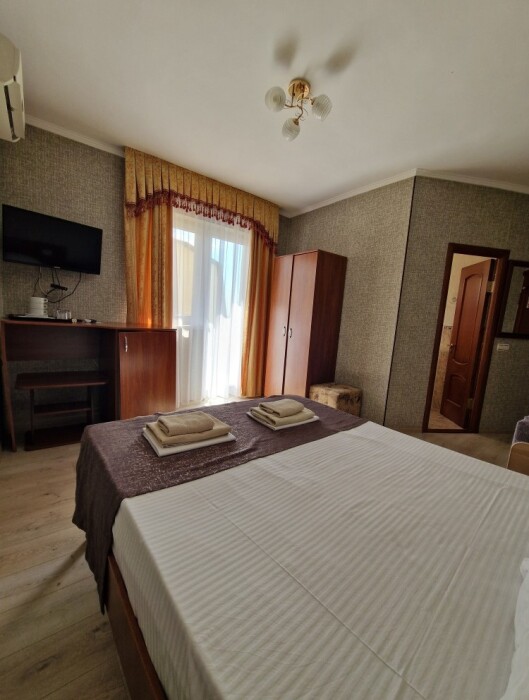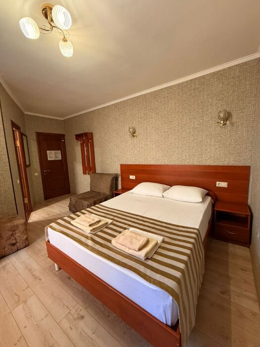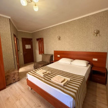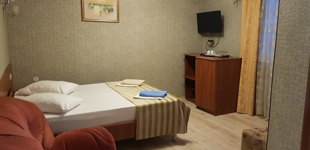 В номере: 2 односпальные кровати (70*190 см) или двуспальная кровать (150*190 см) и дополнительное место - кресло раскладное (70*190), телевизор жк (20 каналов), мини-холодильник, сплит система, сейф, фен, душ, туалет, основной набор посуды.