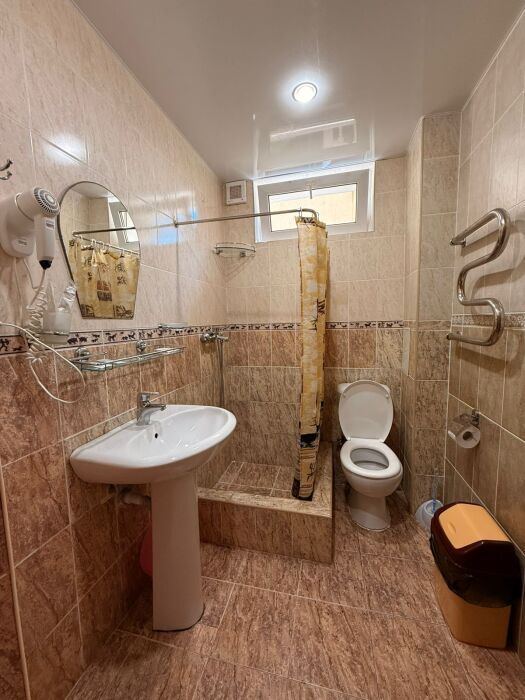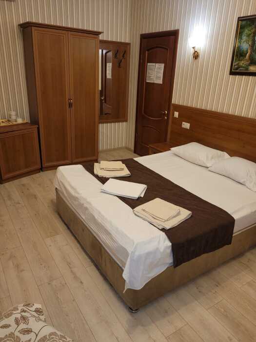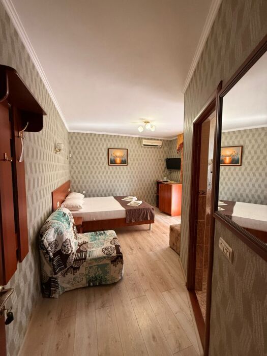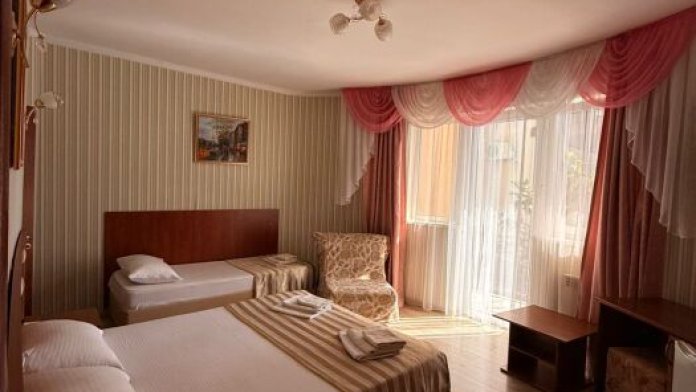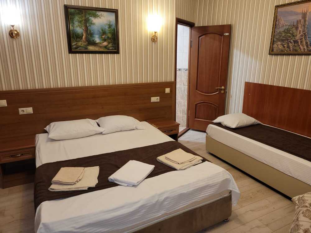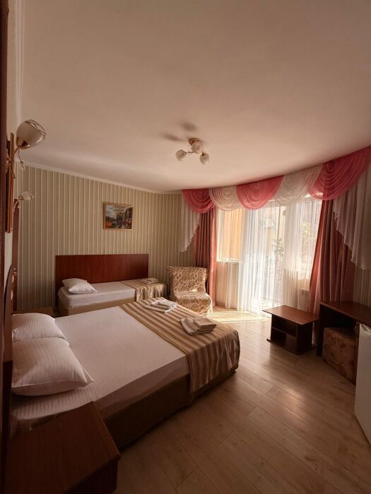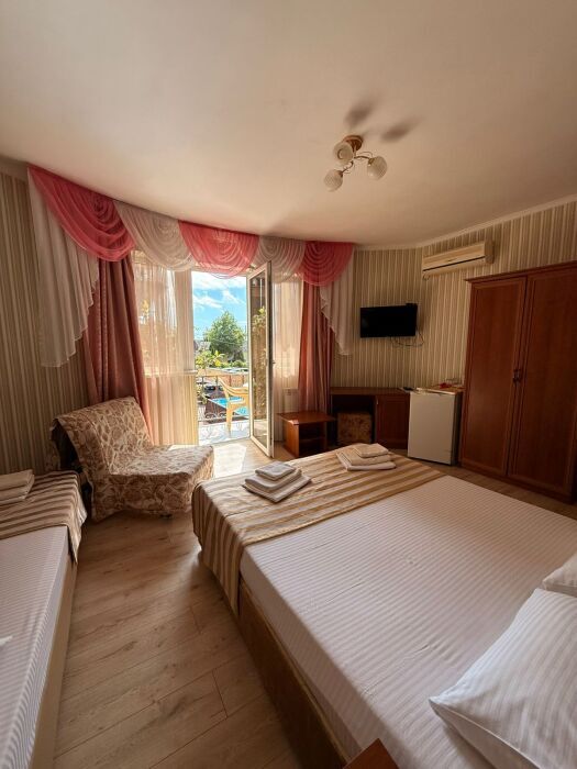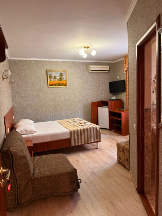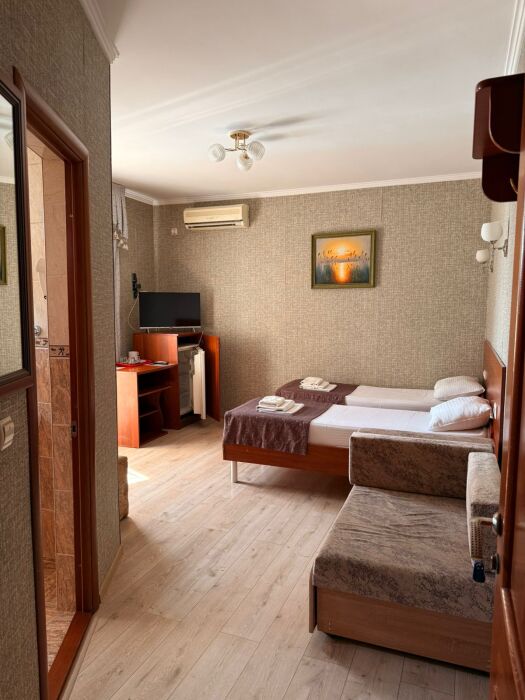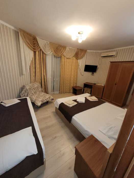 В номере: односпальная кровать (70*190 см) и двуспальная кровать (150*190 см) и дополнительное место - кресло раскладное (70*190), телевизор жк (20 каналов), мини-холодильник, сплит система, сейф, фен, душ, туалет, основной набор посуды.
