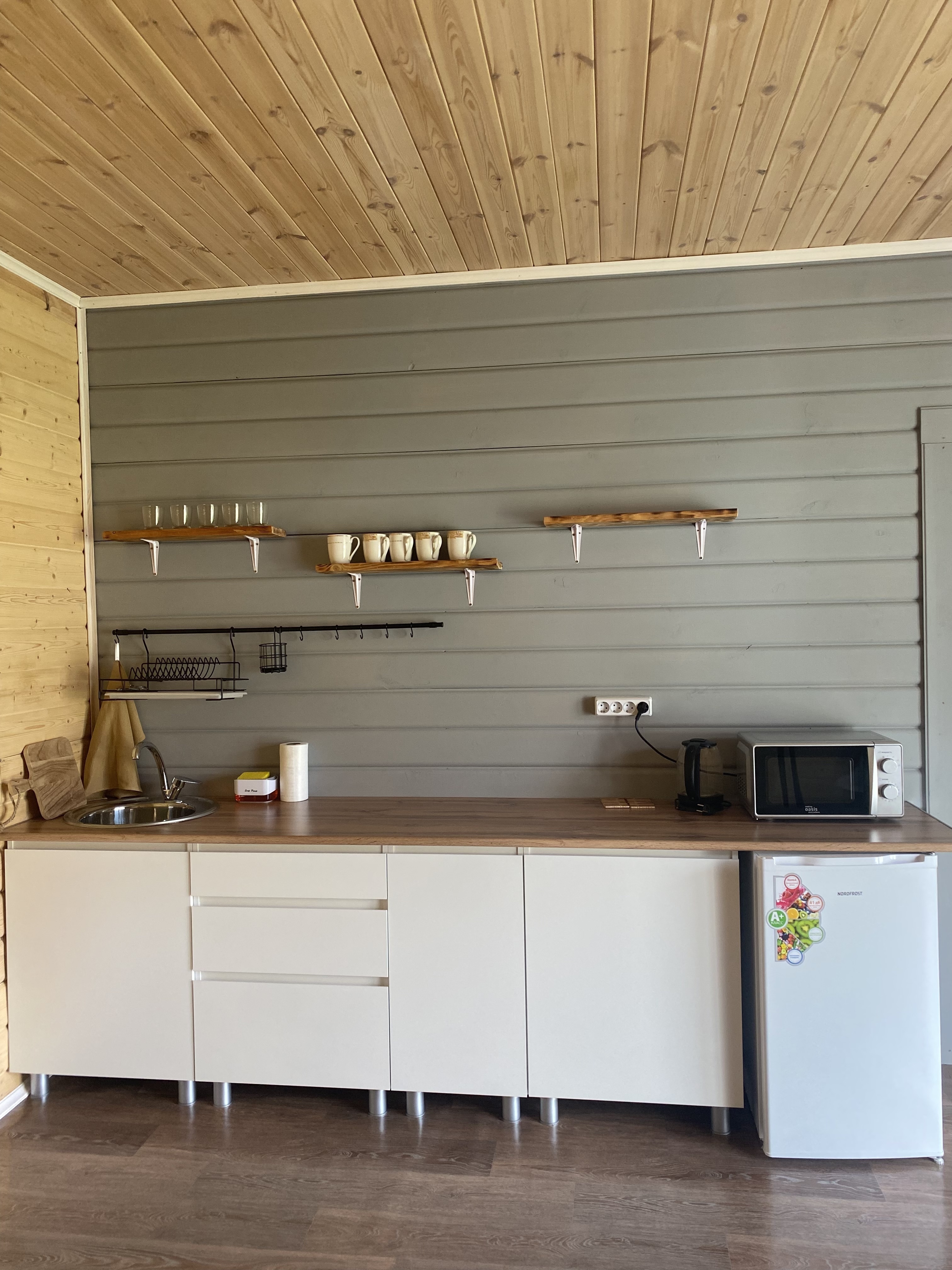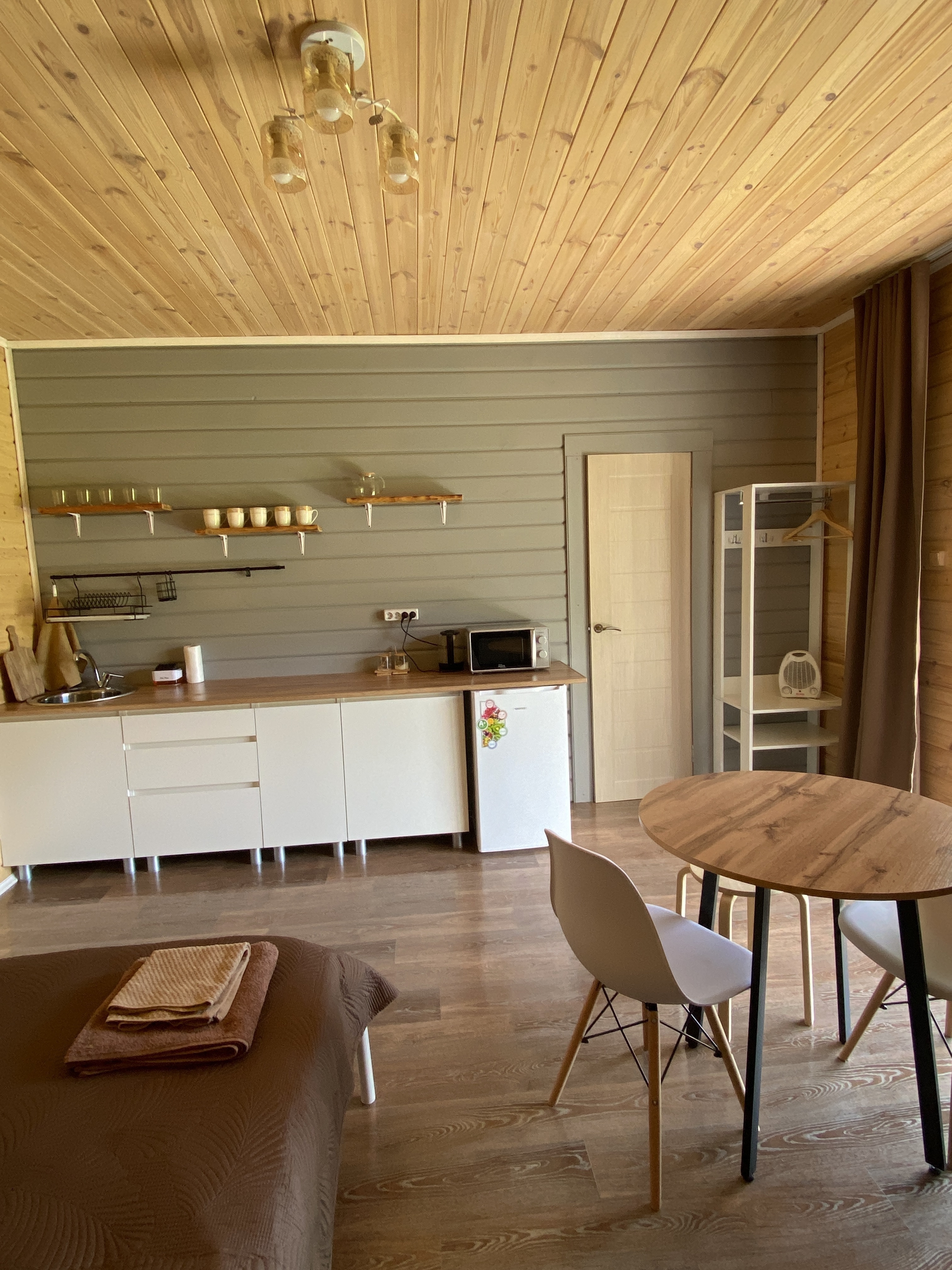 В номере санузел с горячей и холодной водой, своя кухня и все необходимое для приготовления еды.