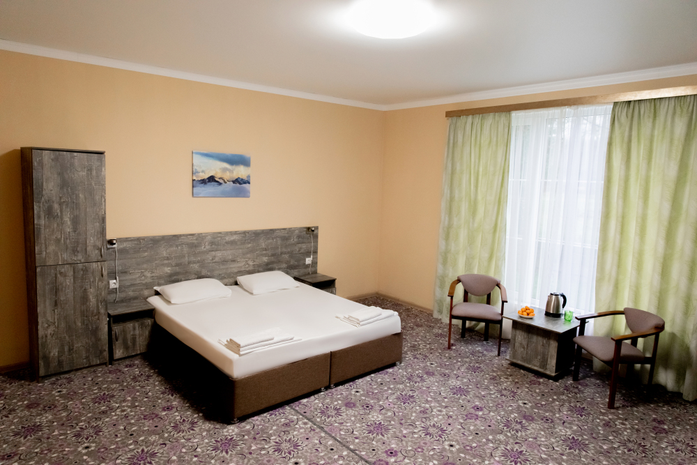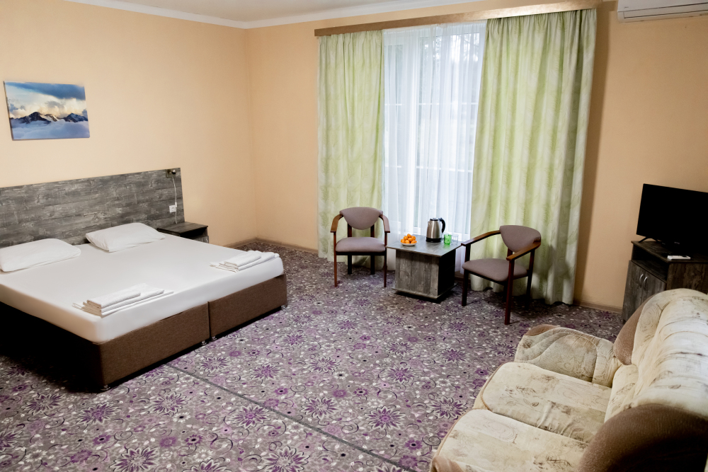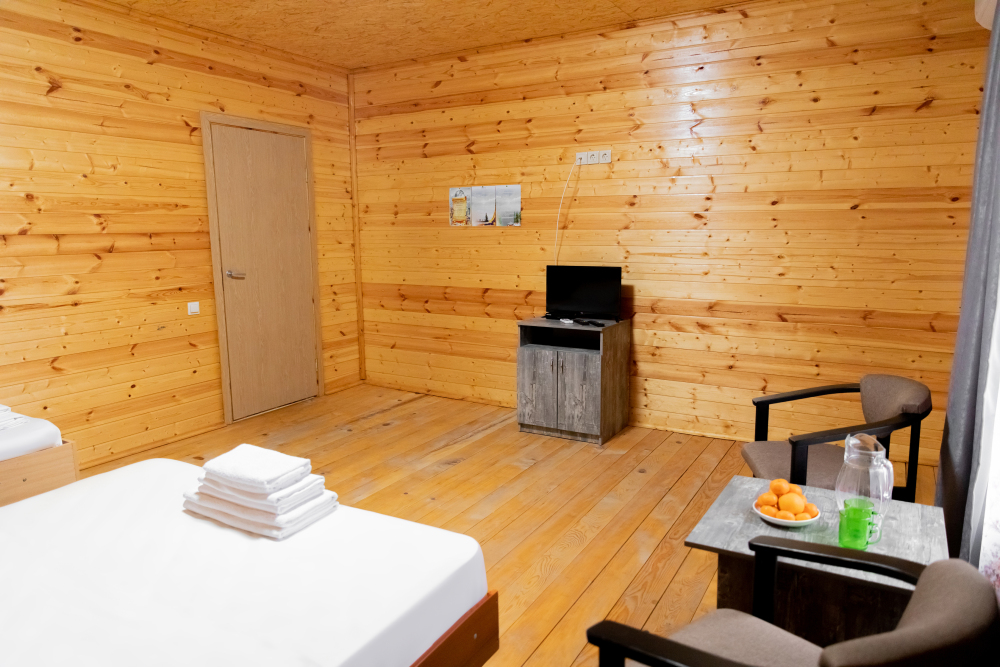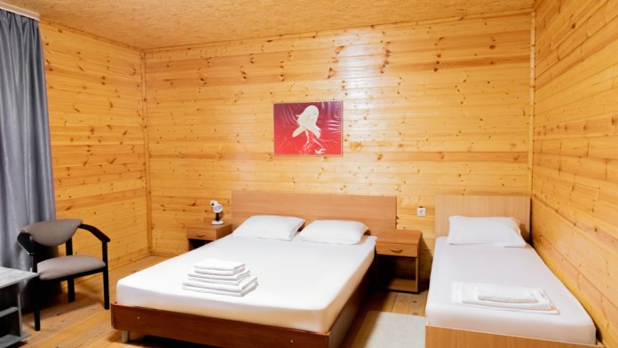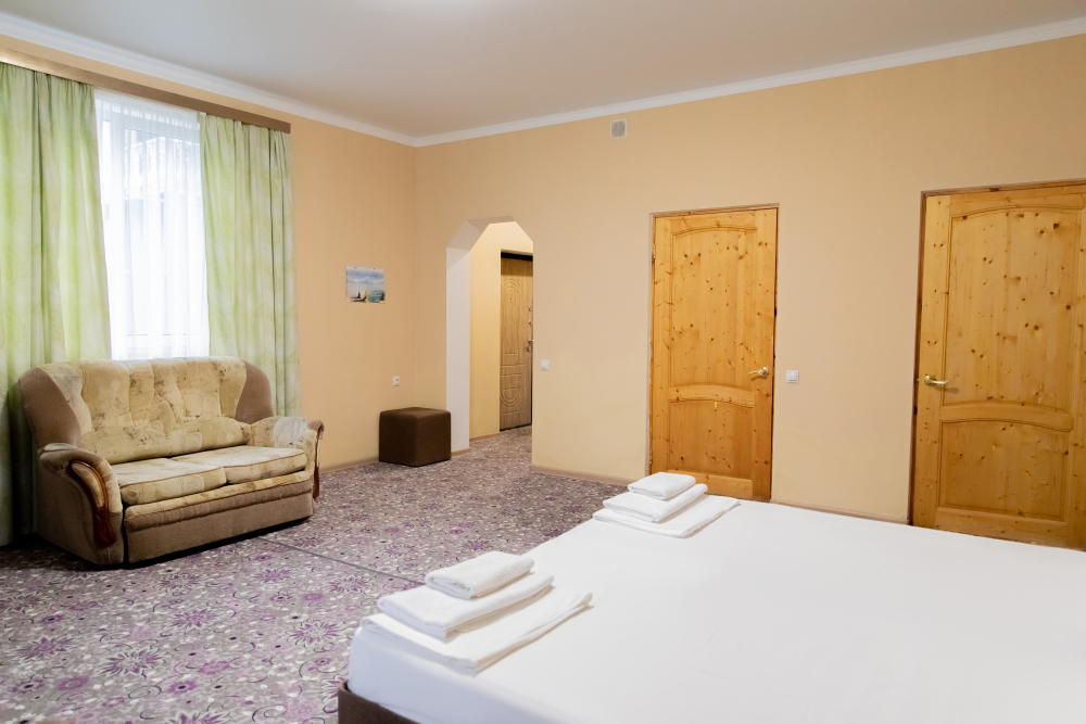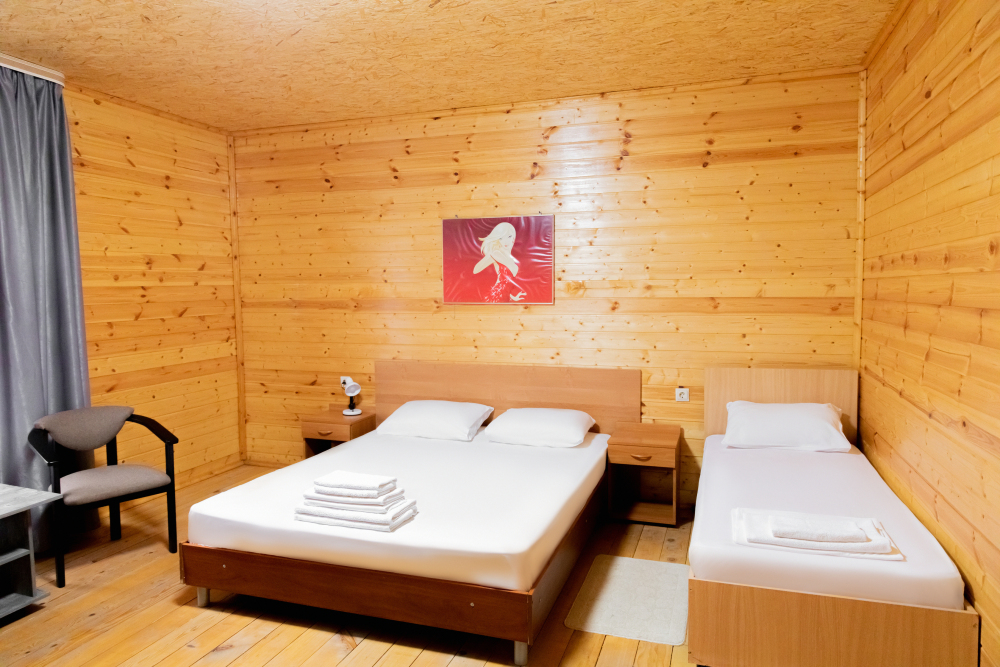 Просторный 2х-комнатный номер создан для комфортного отдыха всей семьи. В первой комнате широкая 2-спальная кровать (с возможностью разделения на 2 односпальные). Во второй комнате предусмотрена 2х-ярусная кровать. Номер оснащён телевизором, скоростным Wi-Fi, мини-холодильником, электрическим чайником, кувшином и стаканами, уличной сушилкой.