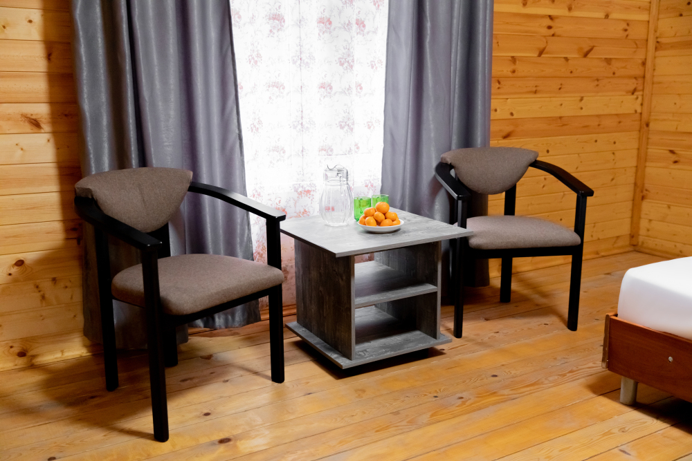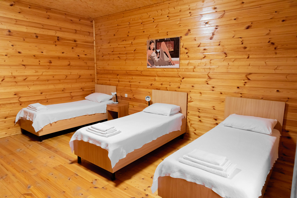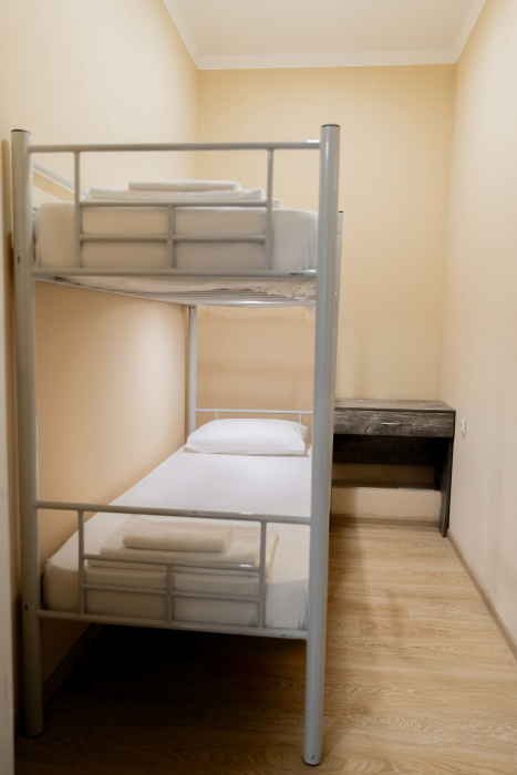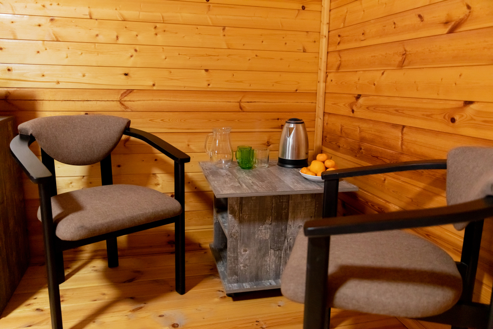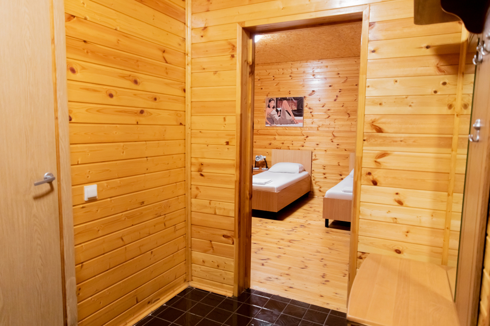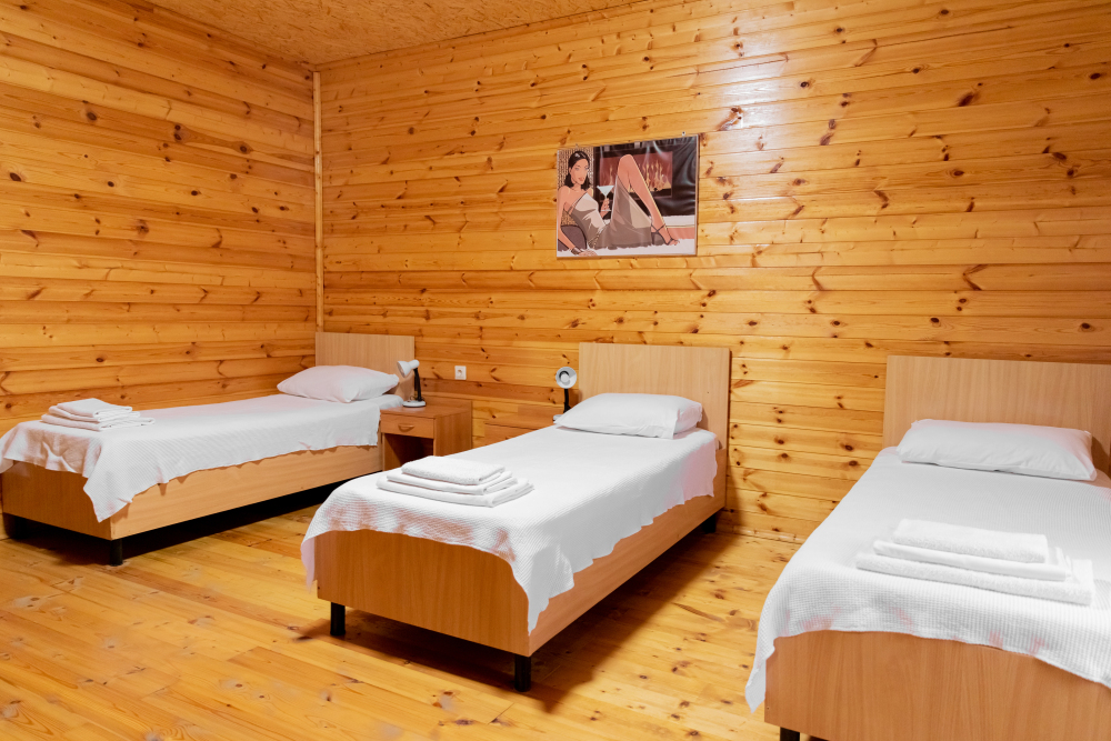 Просторный 2х-комнатный номер создан для комфортного отдыха всей семьи. В первой комнате широкая 2-спальная кровать (с возможностью разделения на 2 односпальные). Во второй комнате предусмотрена 2х-ярусная кровать. Номер оснащён телевизором, скоростным Wi-Fi, мини-холодильником, электрическим чайником, кувшином и стаканами, уличной сушилкой.