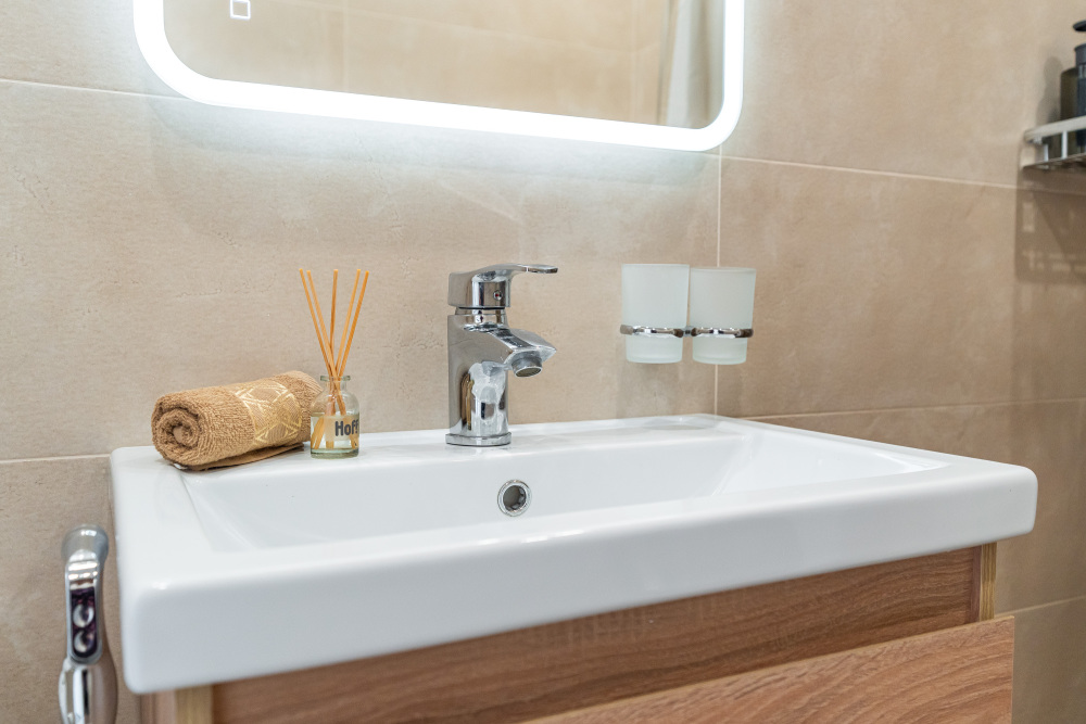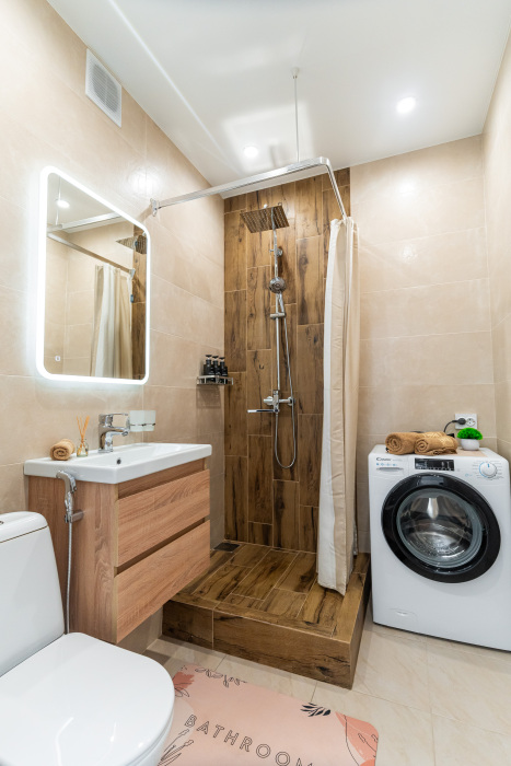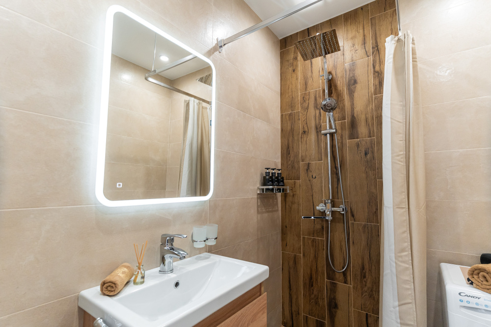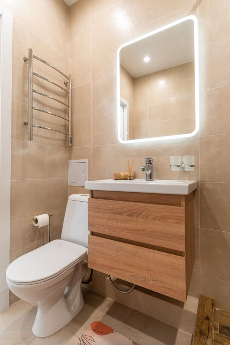 - Современная ванная комната с подсветкой зеркала и тёплым ковриком.