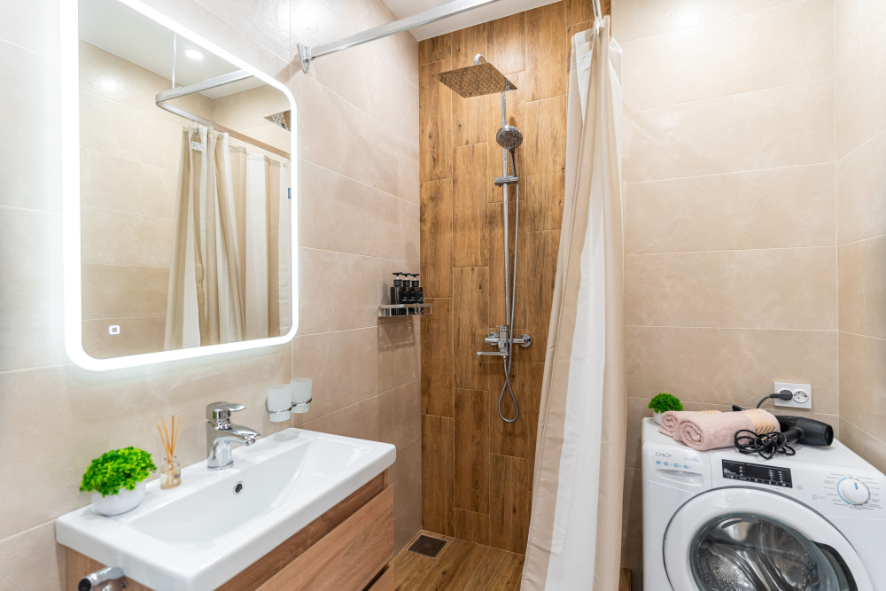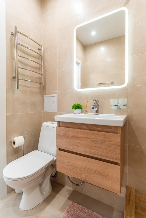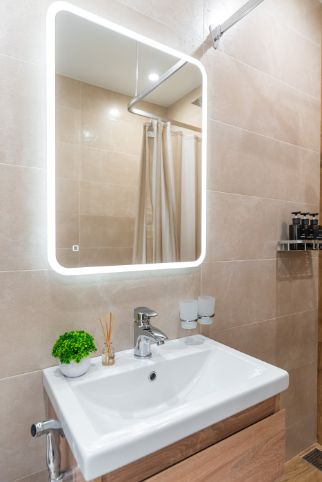 - Современная ванная комната с подсветкой зеркала и тёплым ковриком.