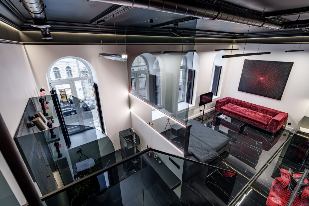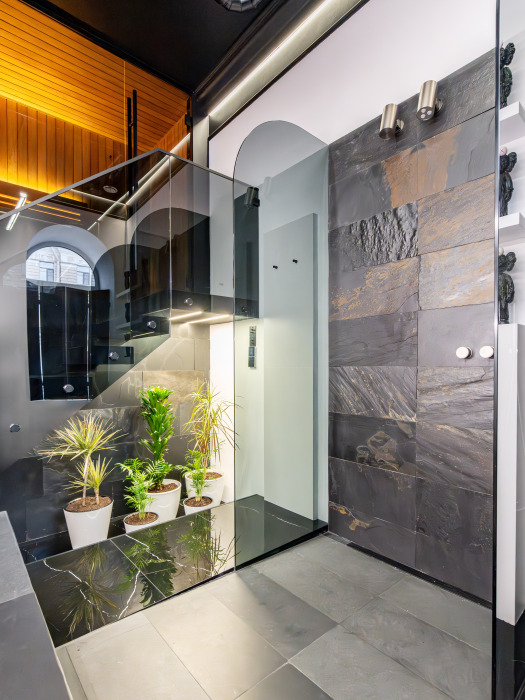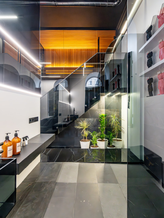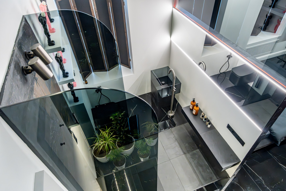 Студия выполнена по уникальному дизайн-проекту. Каждая деталь здесь продумана до мелочей, начиная с нестандартного зонирования всего пространства студии, заканчивая авторской сантехникой, привезенной из Европы.