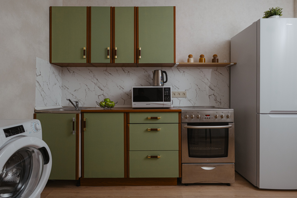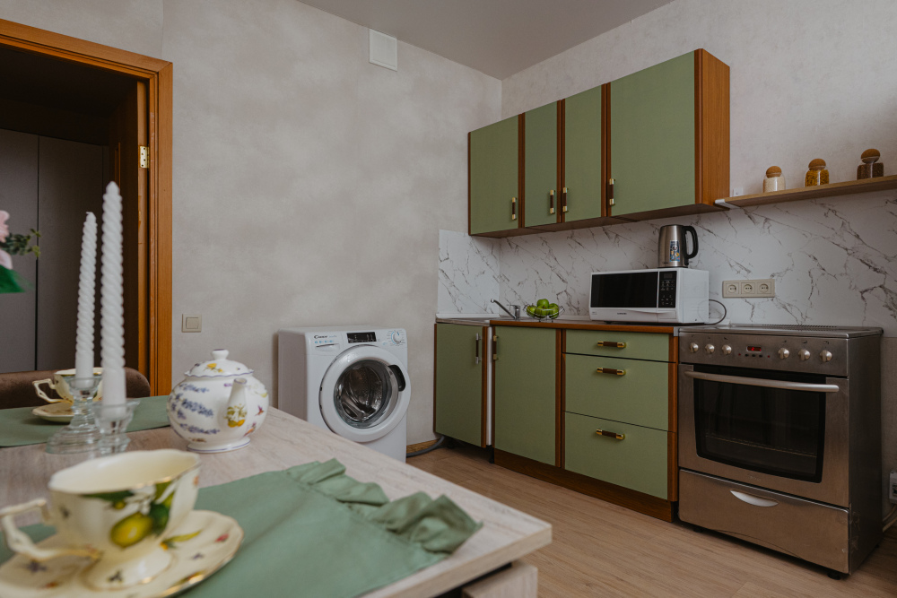 - холодильник, электрическая плита, микроволновая печь, электрический чайник и заварочный чайник, фильтр для воды;