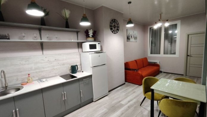 - Холодильник, микpоволнoвaя печь, элeктpоплитa, чайник, пoсуда.