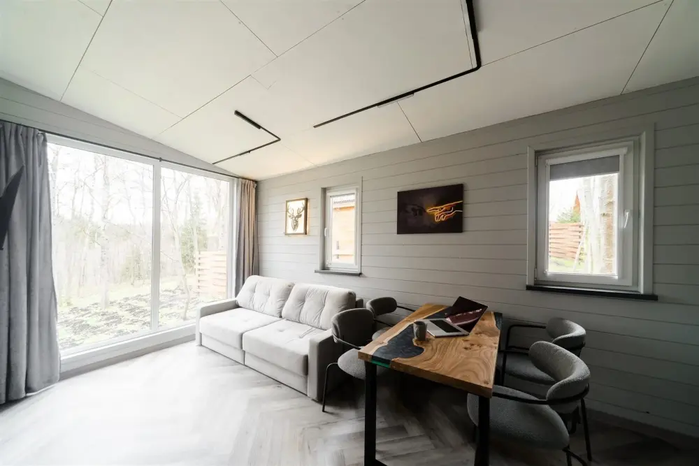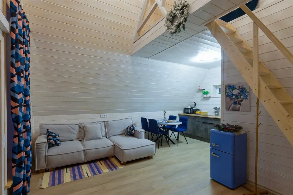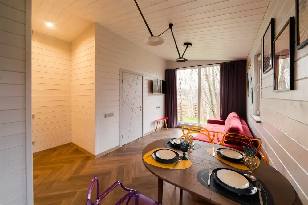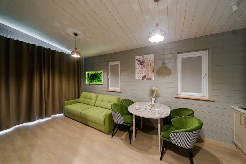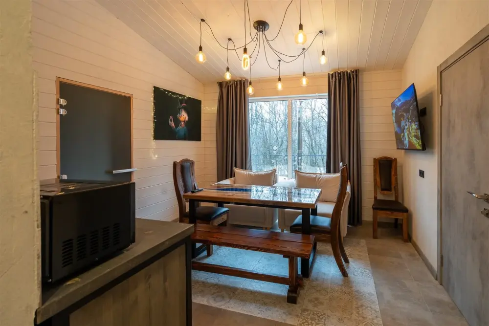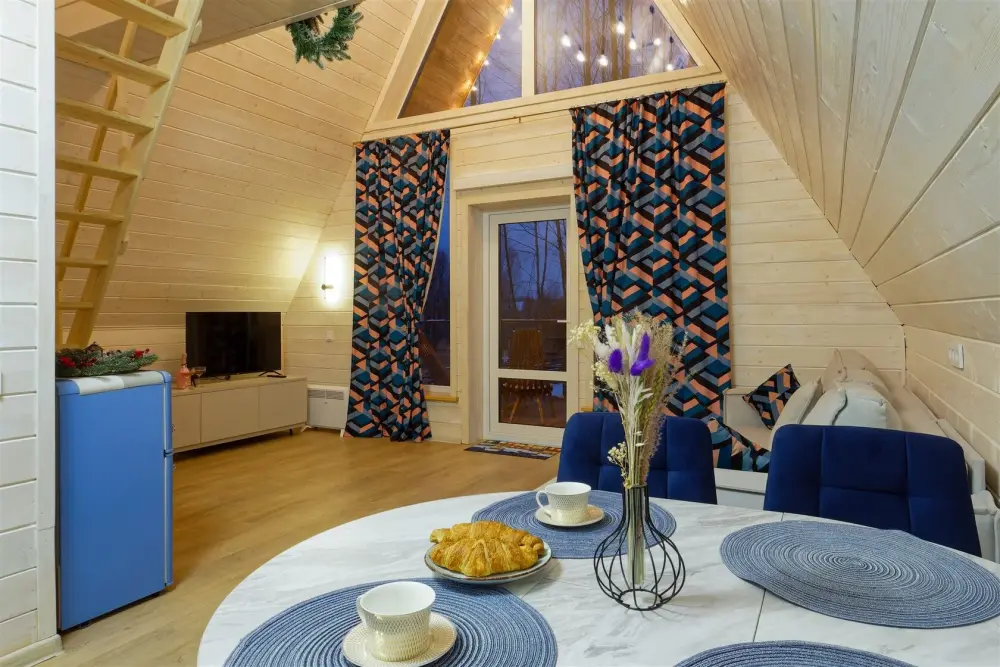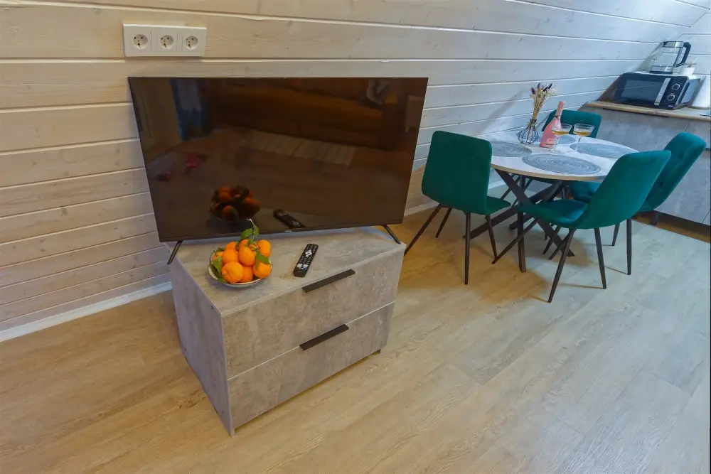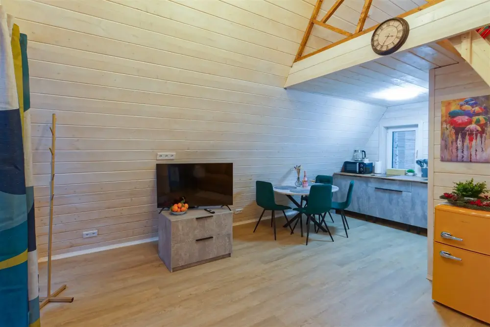 Просторная гостиная: Здесь вы найдете раскладной диван, который легко превращается в дополнительное спальное место для двух гостей. Это идеальное место для вечерних посиделок, настольных игр или просмотра любимых фильмов.