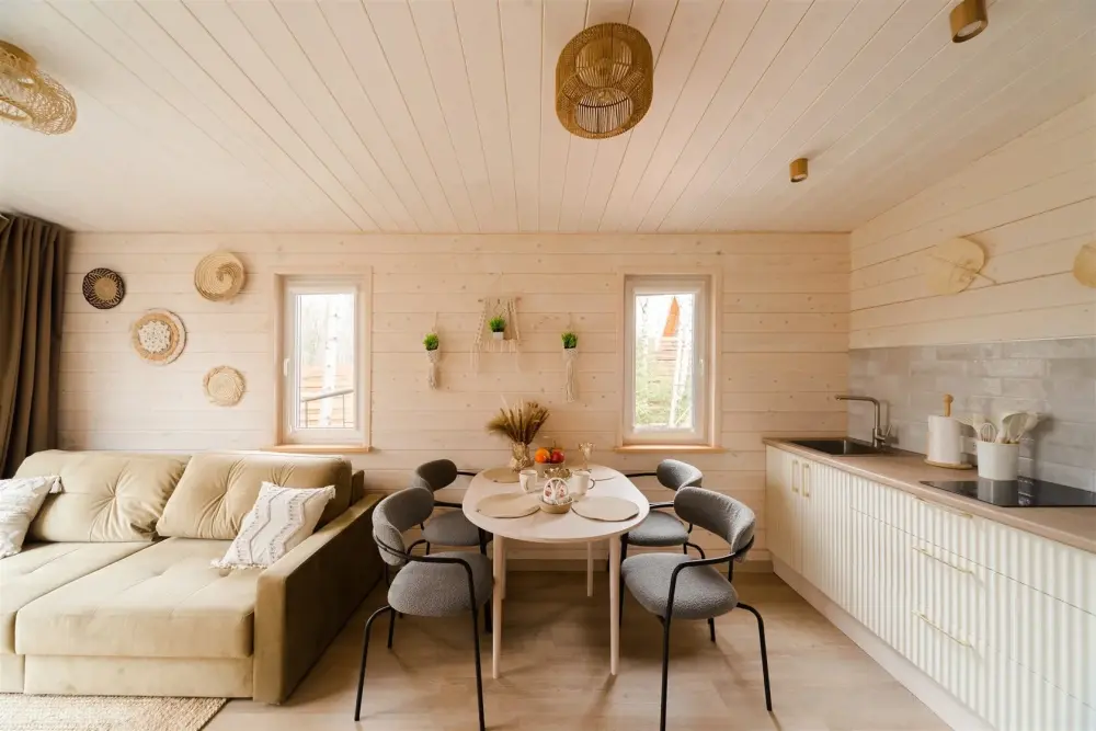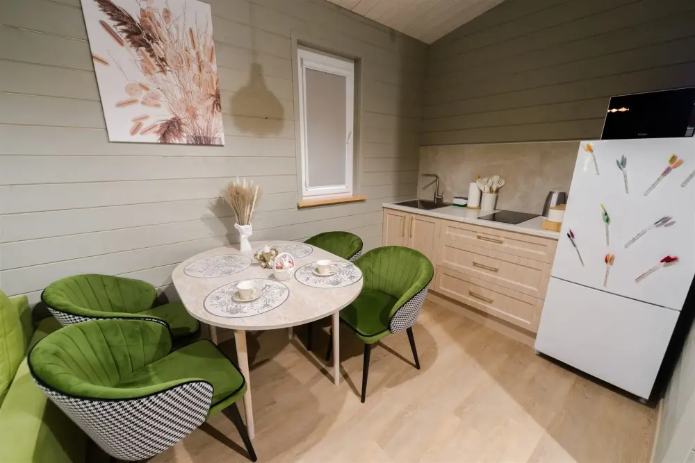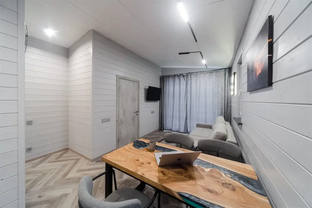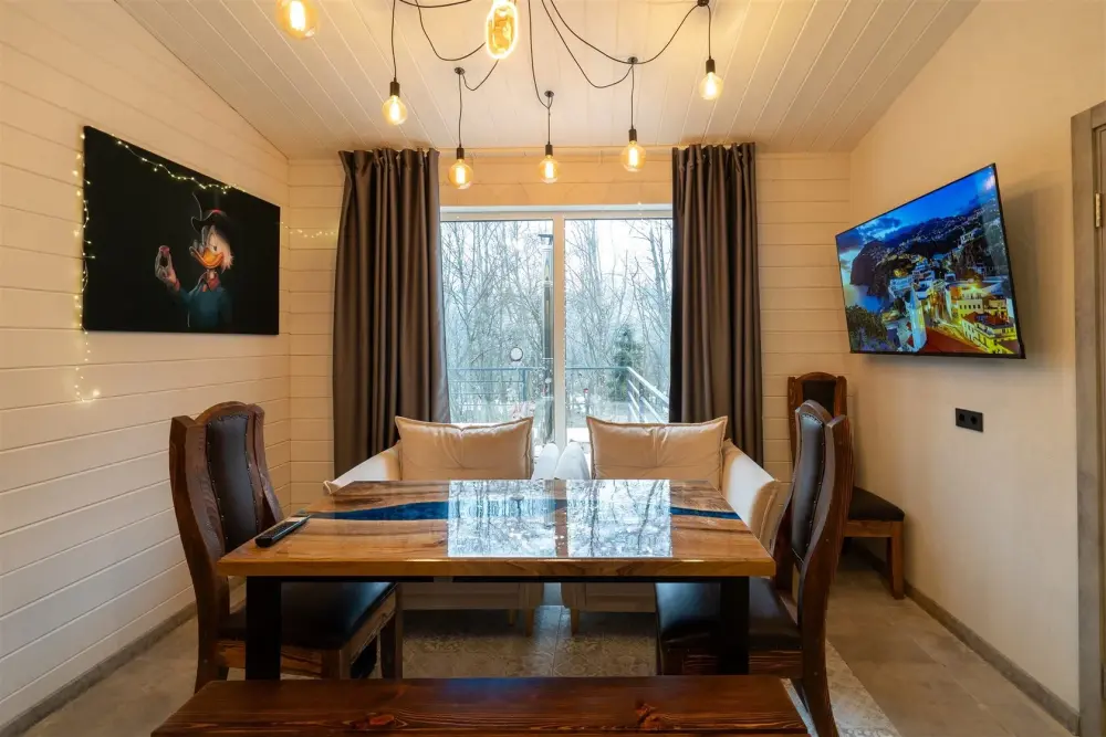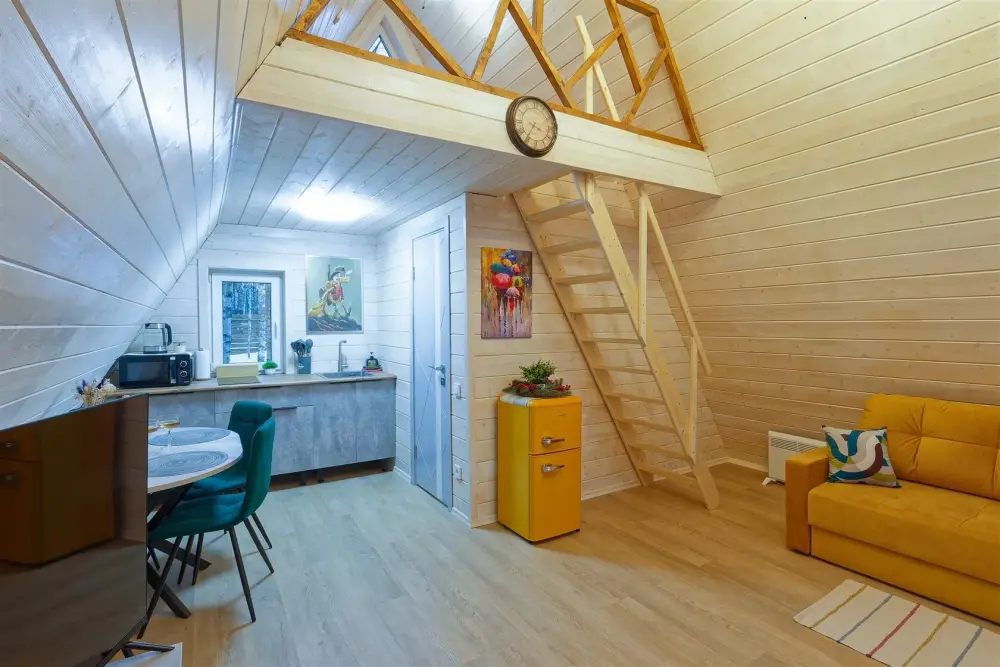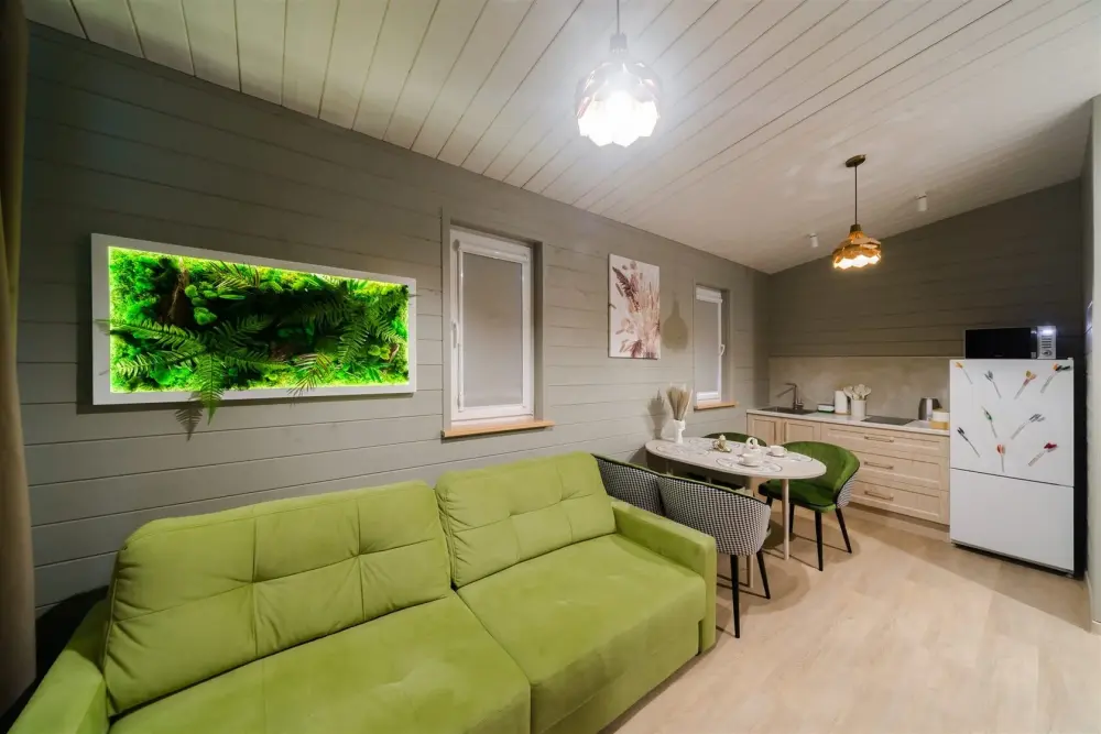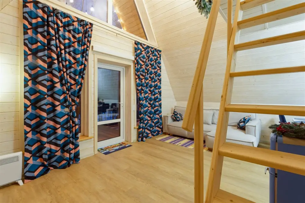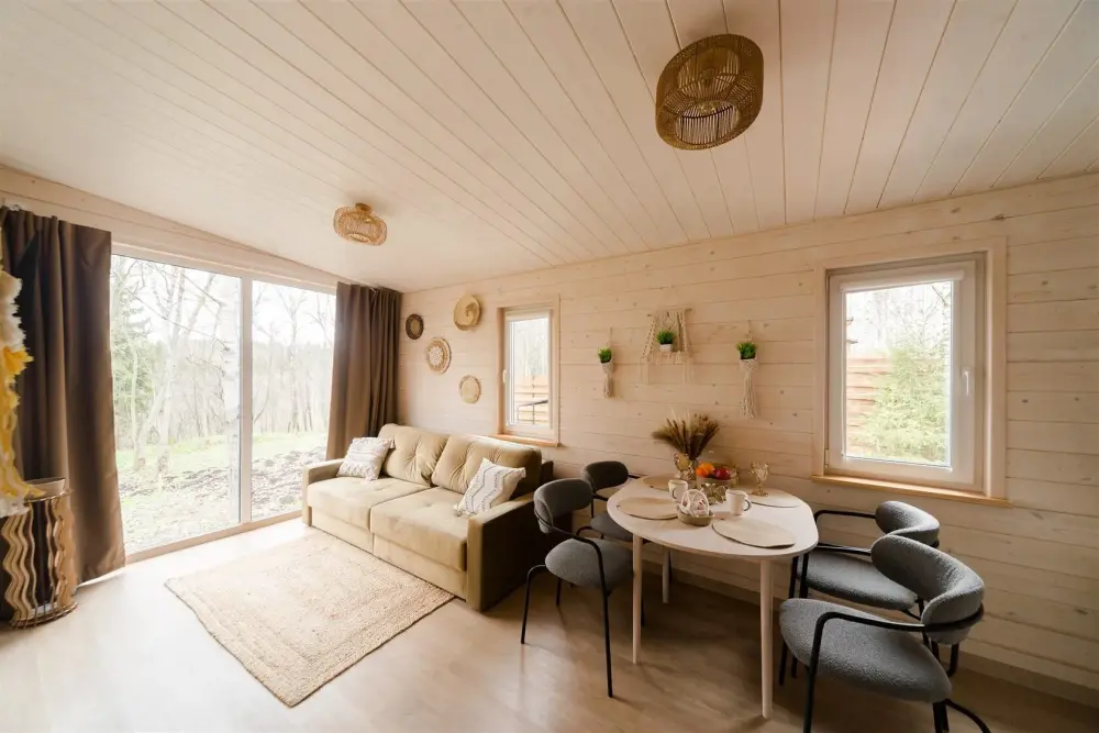 Просторная гостиная: Здесь вы найдете раскладной диван, который легко превращается в дополнительное спальное место для двух гостей. Это идеальное место для вечерних посиделок, настольных игр или просмотра любимых фильмов.