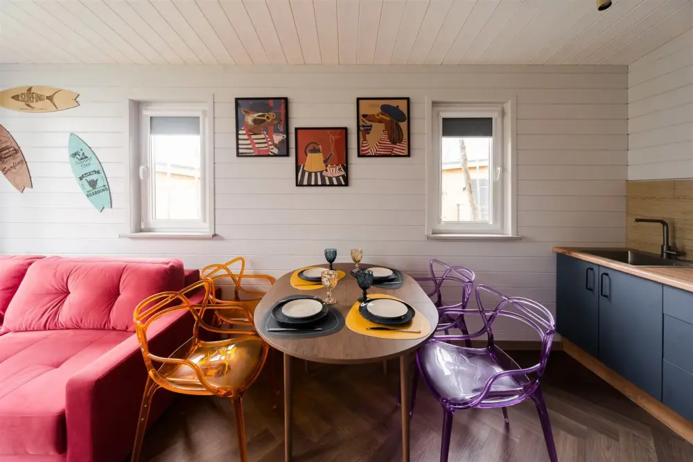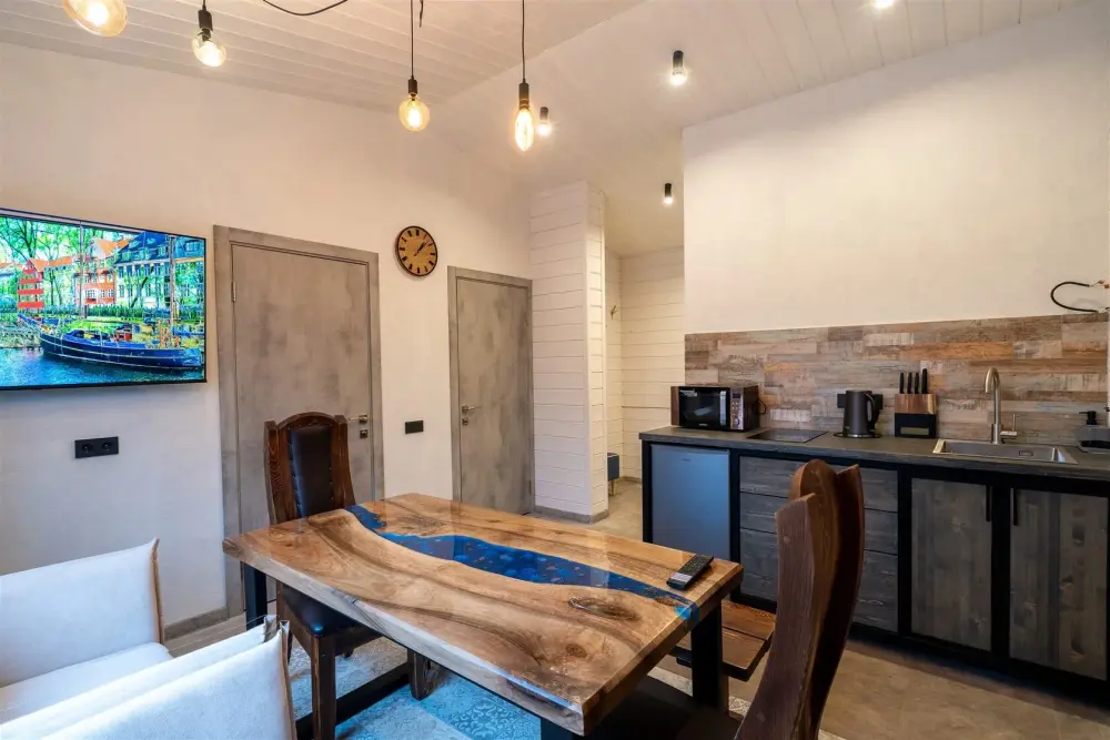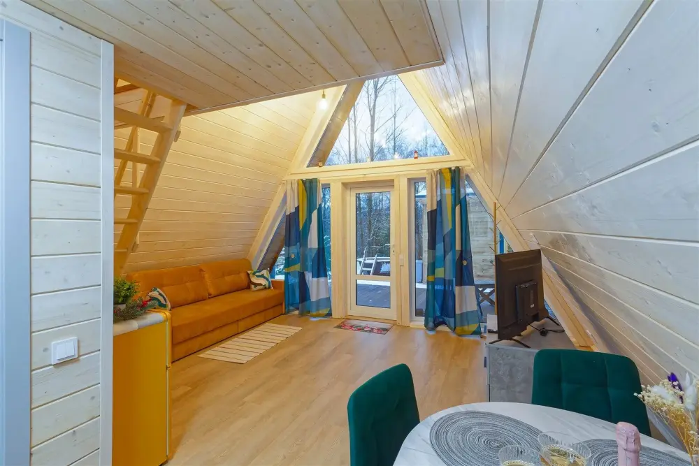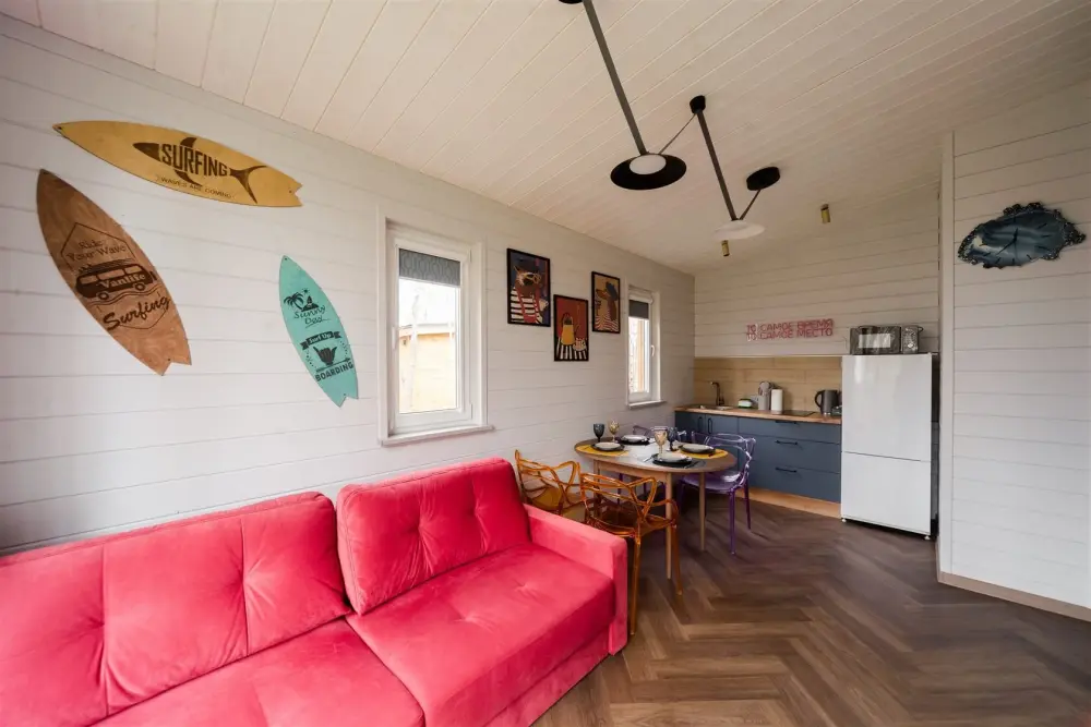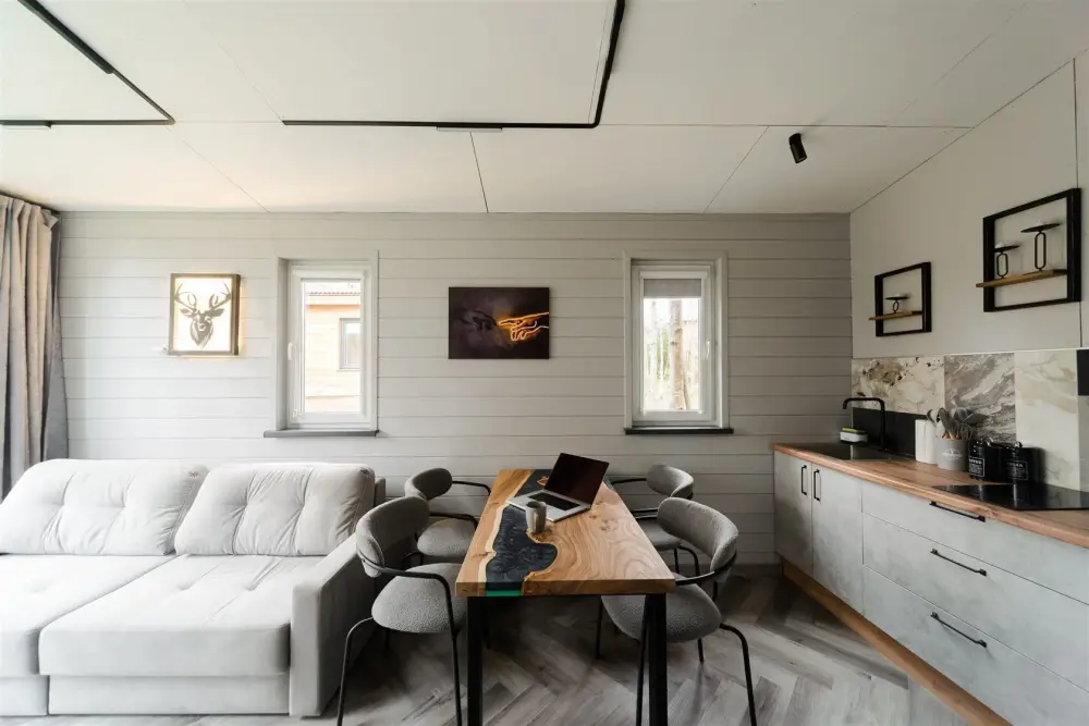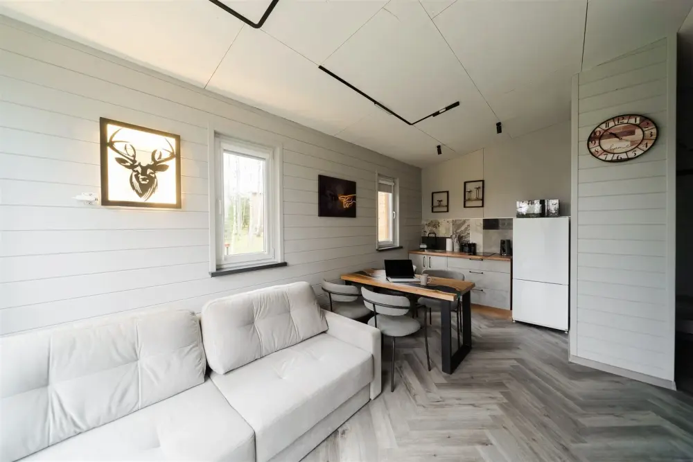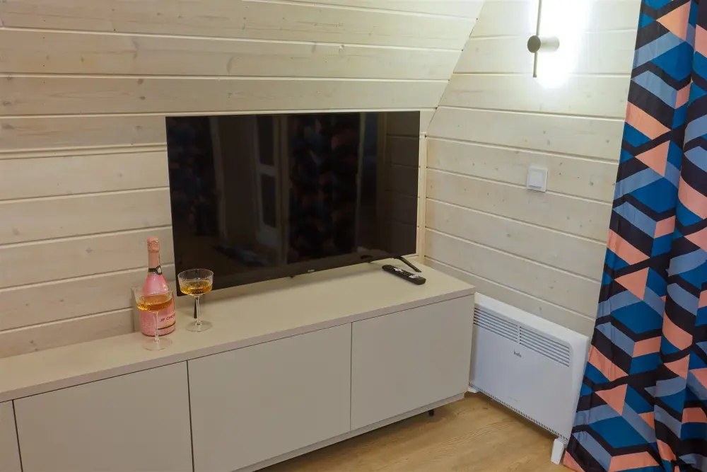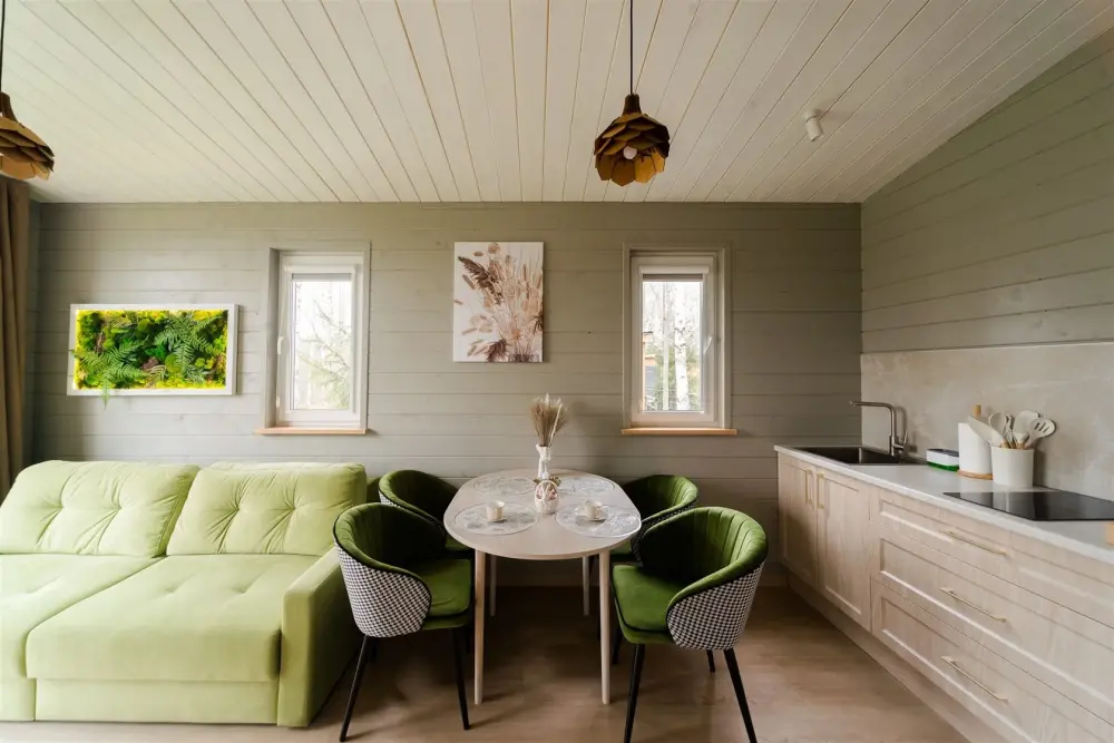 Просторная гостиная: Здесь вы найдете раскладной диван, который легко превращается в дополнительное спальное место для двух гостей. Это идеальное место для вечерних посиделок, настольных игр или просмотра любимых фильмов.