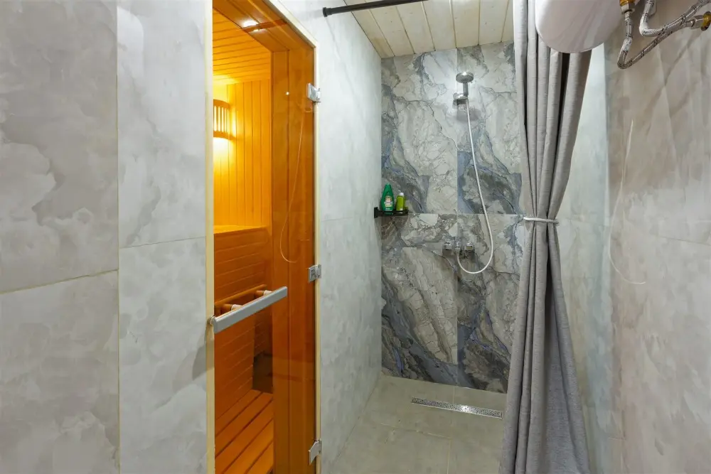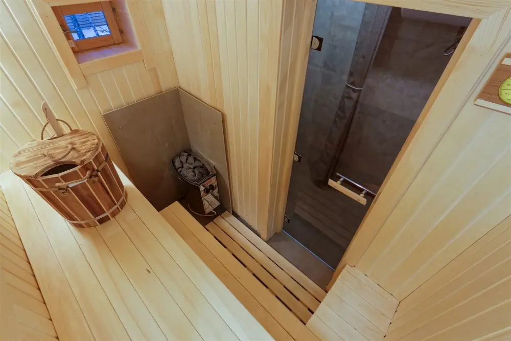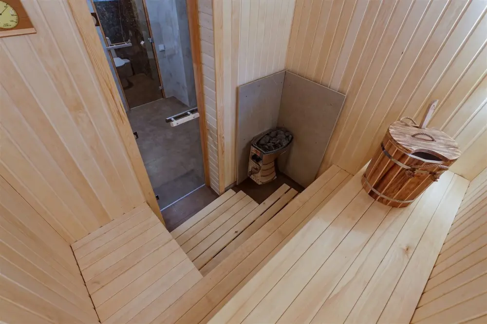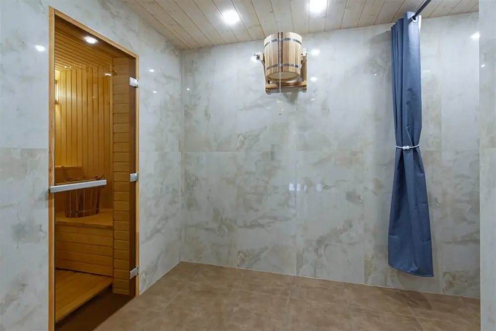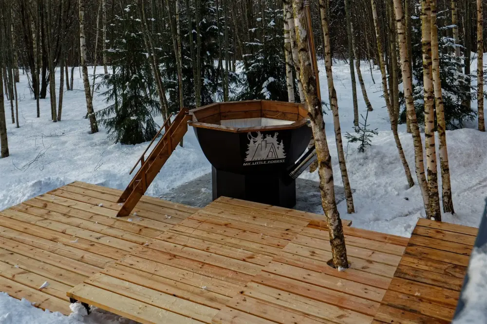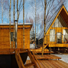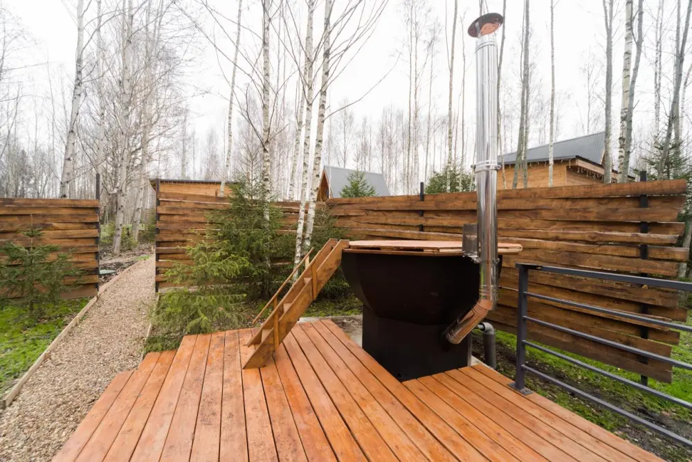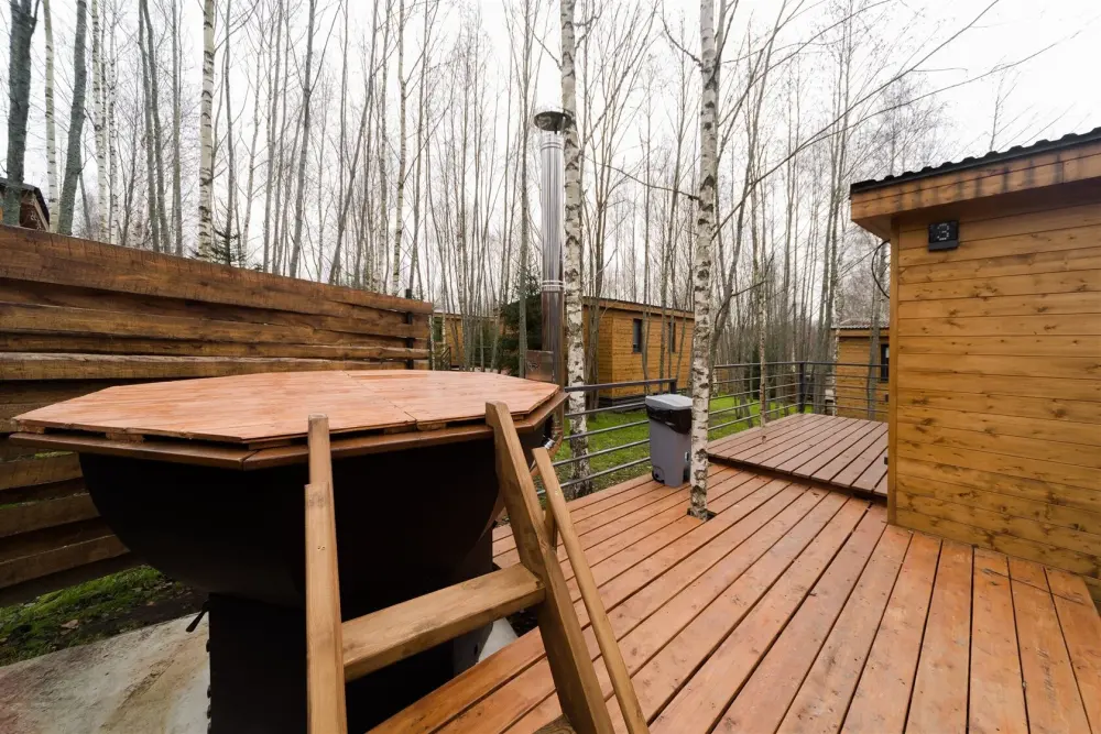 У каждого домика свой банный чан с подогревом на открытом воздухе, где вы можете расслабиться и попариться, как в холодное время года, так и летом, прохладными вечерами. Чан можно украсить лепестками цветов, пихтовыми ветками или дольками цитрусовых, что удвоит оздоровительный эффект, да и просто выглядит эстетично.
