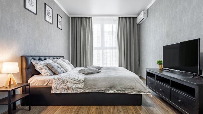 - просторная комната с большой двуспальной кроватью, уютным диваном, телевизором и стильным журнальным столиком;