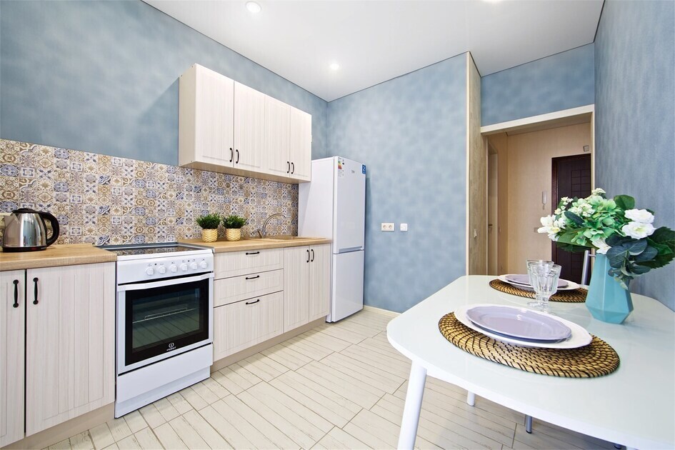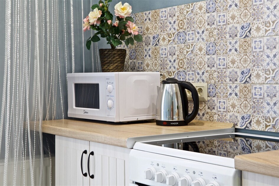 - современная кухня с обеденным столом, кухонным гарнитуром, электроплитой, холодильником, микроволновой печью, электрочайником и всей необходимой посудой;