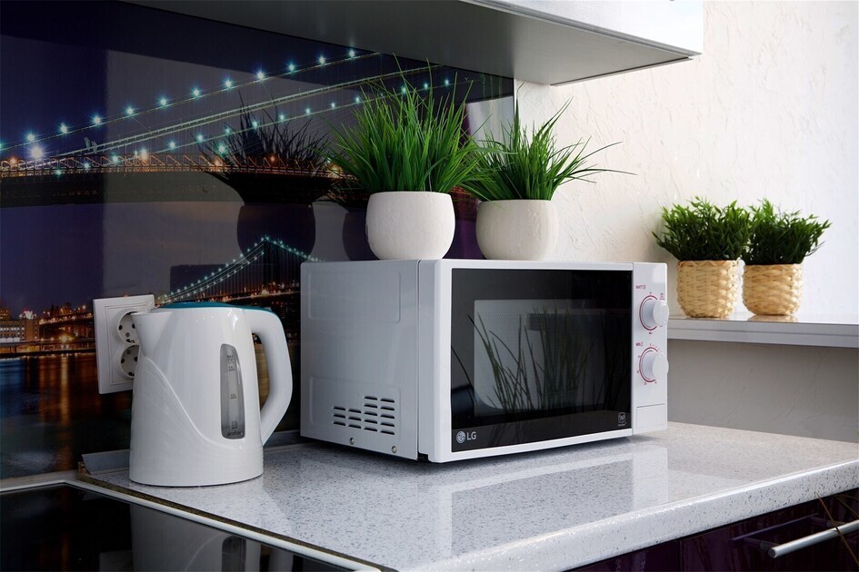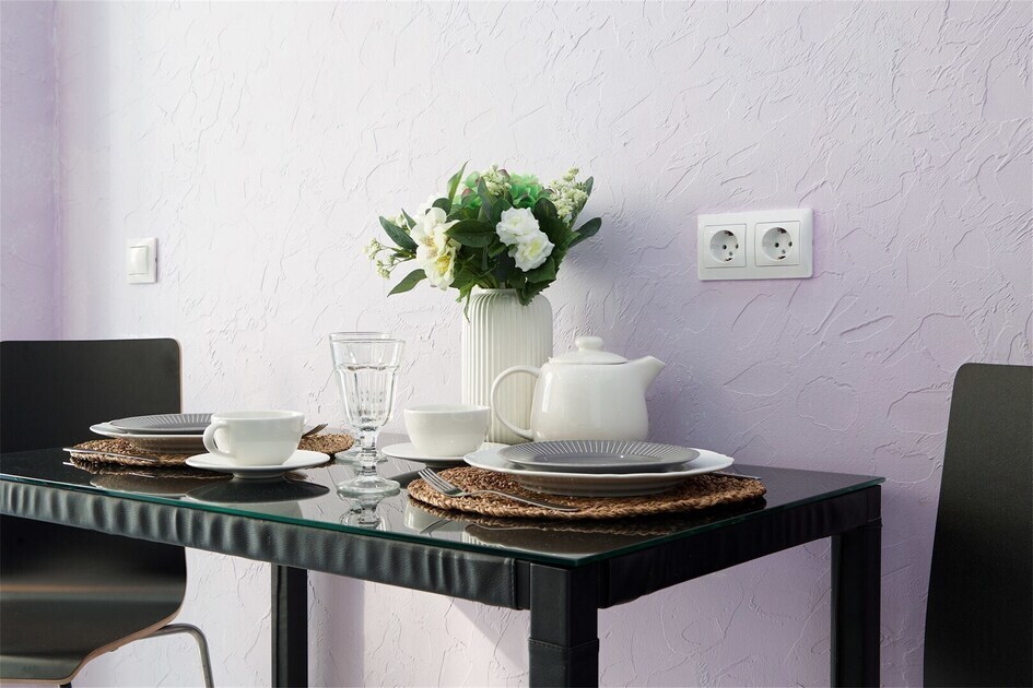 - современная кухня с обеденным столом, кухонным гарнитуром, электроплитой, холодильником, микроволновой печью, электрочайником и всей необходимой посудой;