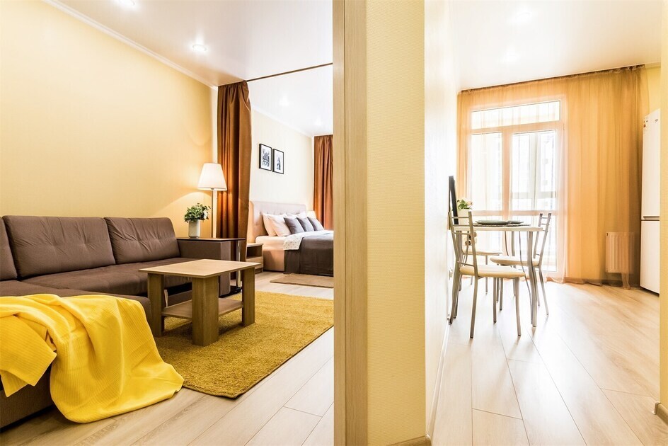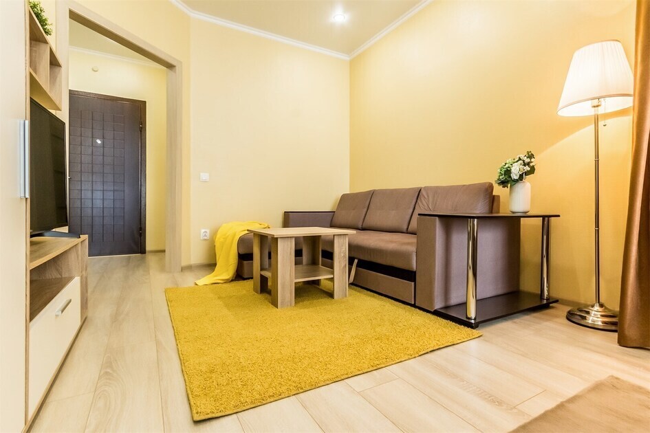 - просторная комната с большой двуспальной кроватью, уютным диваном, телевизором и стильным журнальным столиком;