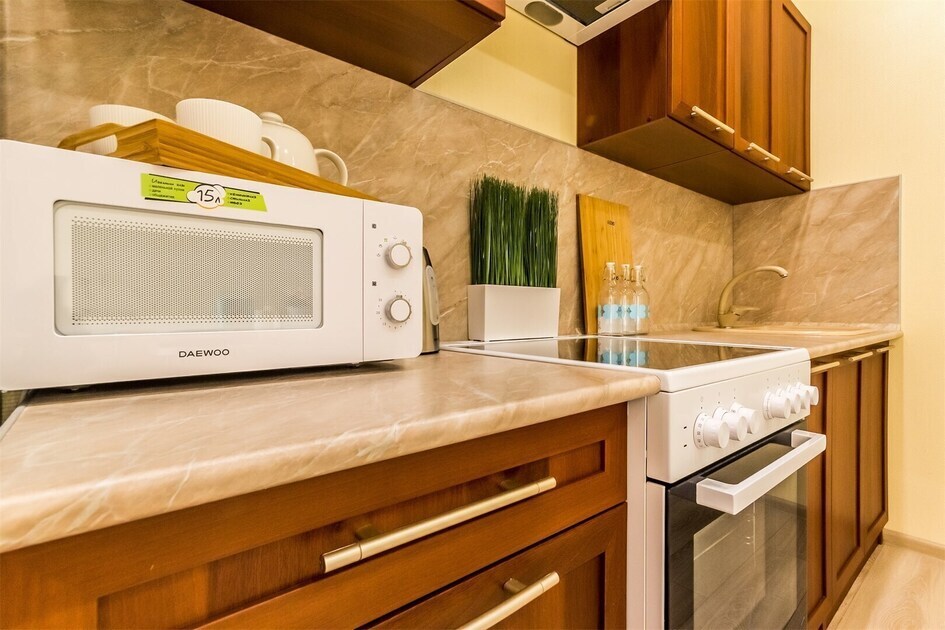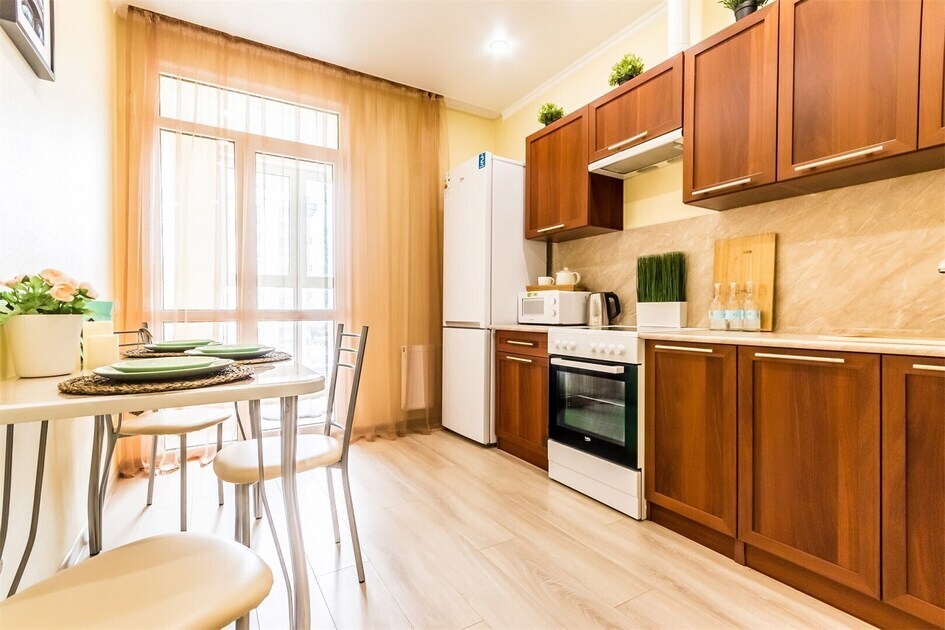 - современная кухня с обеденным столом, кухонным гарнитуром, электроплитой, холодильником, микроволновой печью, электрочайником и всей необходимой посудой;