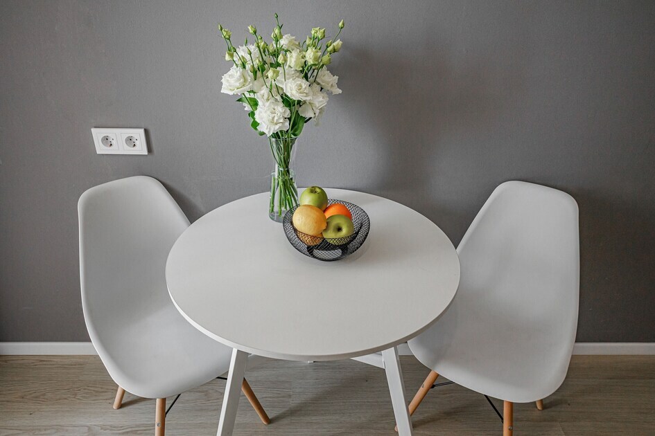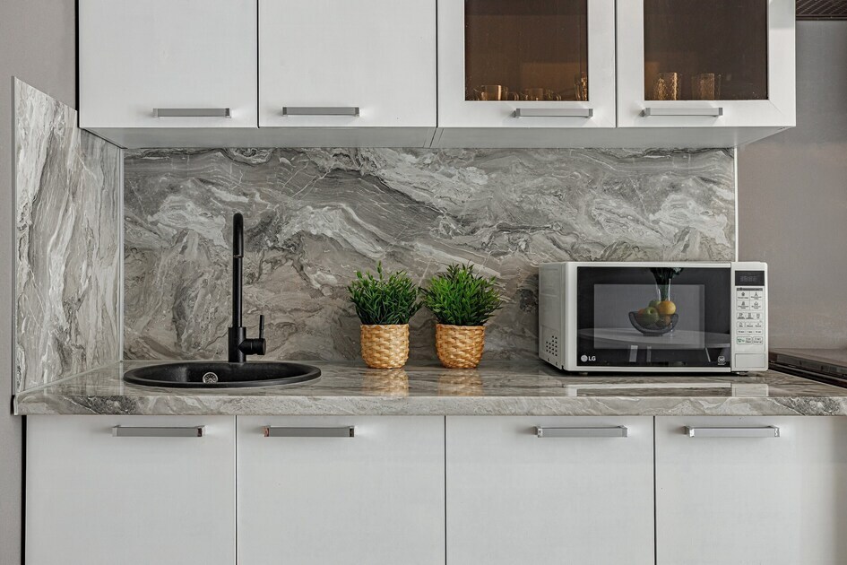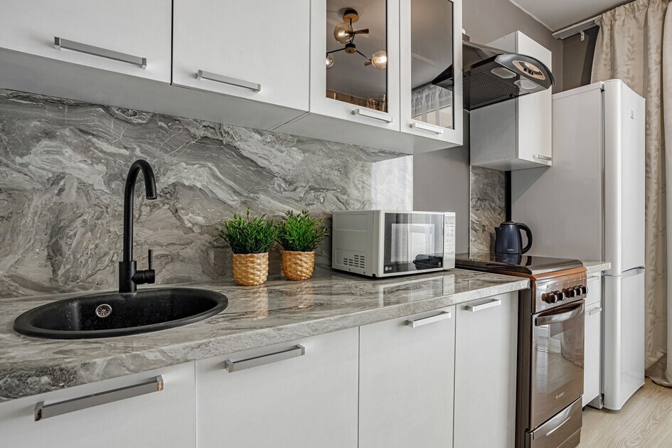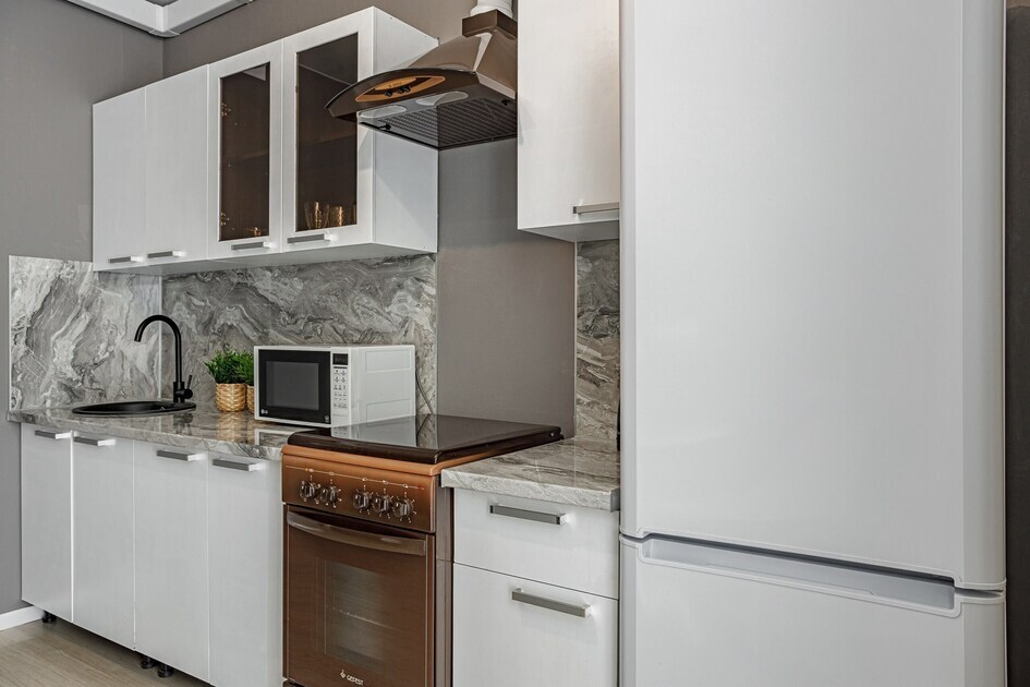 - современная кухня с обеденным столом, кухонным гарнитуром, электроплитой, холодильником, микроволновой печью, электрочайником и всей необходимой посудой;