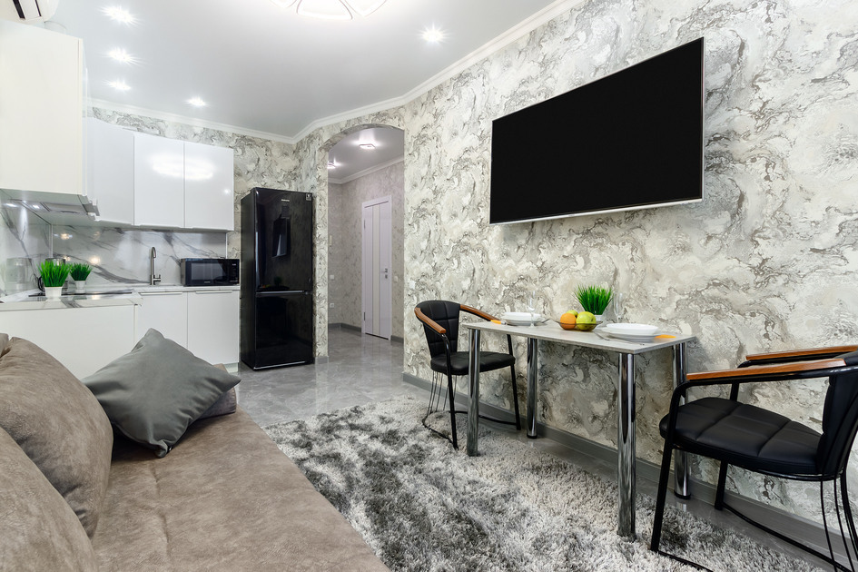 - просторная комната с большой двуспальной кроватью, уютным диваном, телевизором и стильным журнальным столиком;