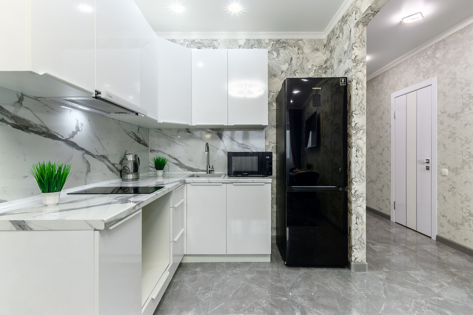 - современная кухня с обеденным столом, кухонным гарнитуром, электроплитой, холодильником, микроволновой печью, электрочайником и всей необходимой посудой;