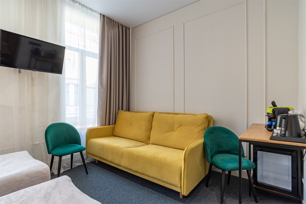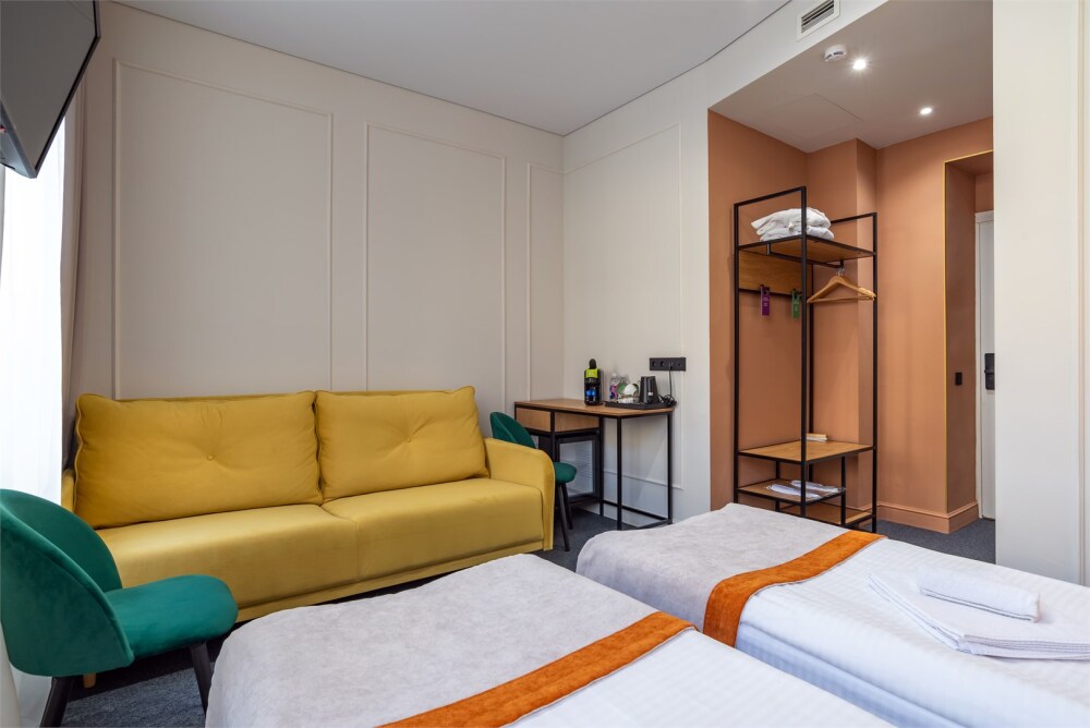 Основные спальные места (кровати) могут трансформироваться в 1 двуспальную или 2 раздельные (в зависимости от предпочтений гостей). Также в номере есть двуспальный раскладной диван, на котором комфортно могут разместиться дополнительно 1 или 2 человека.