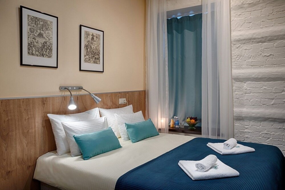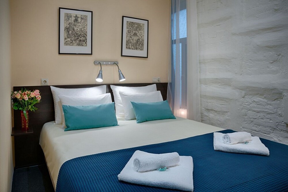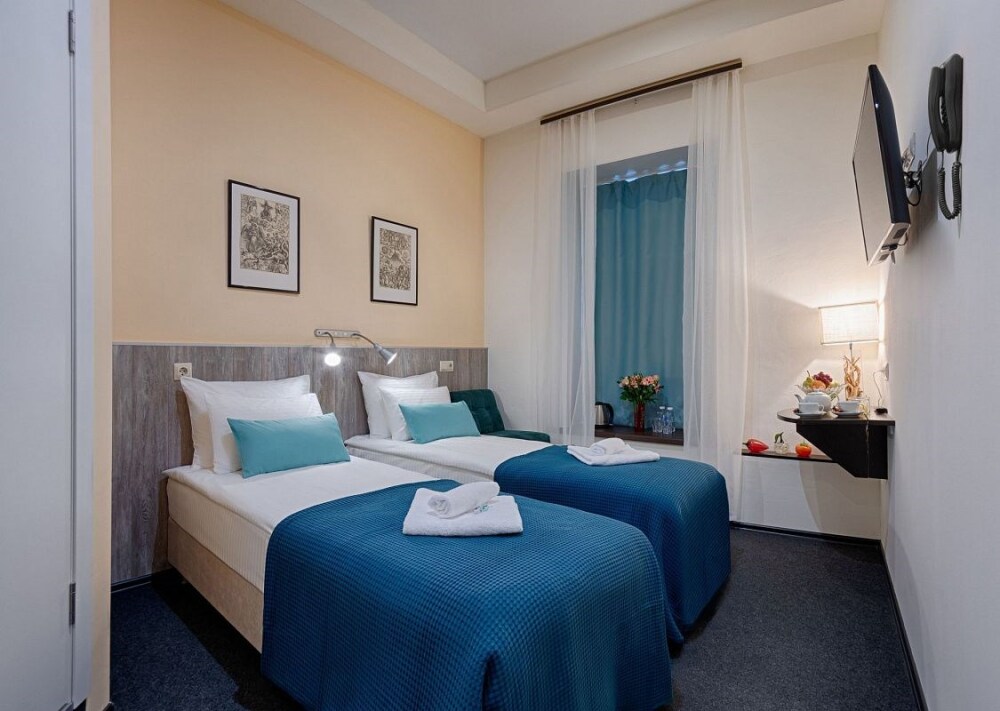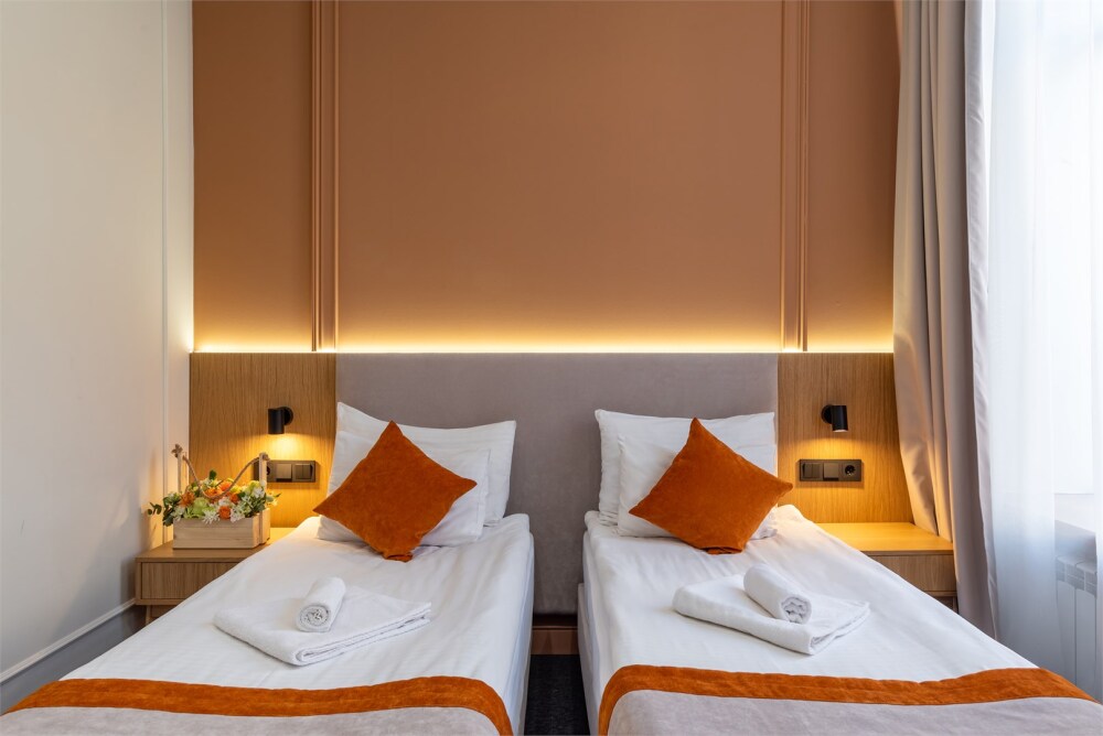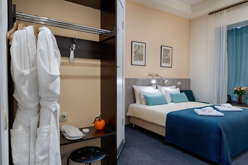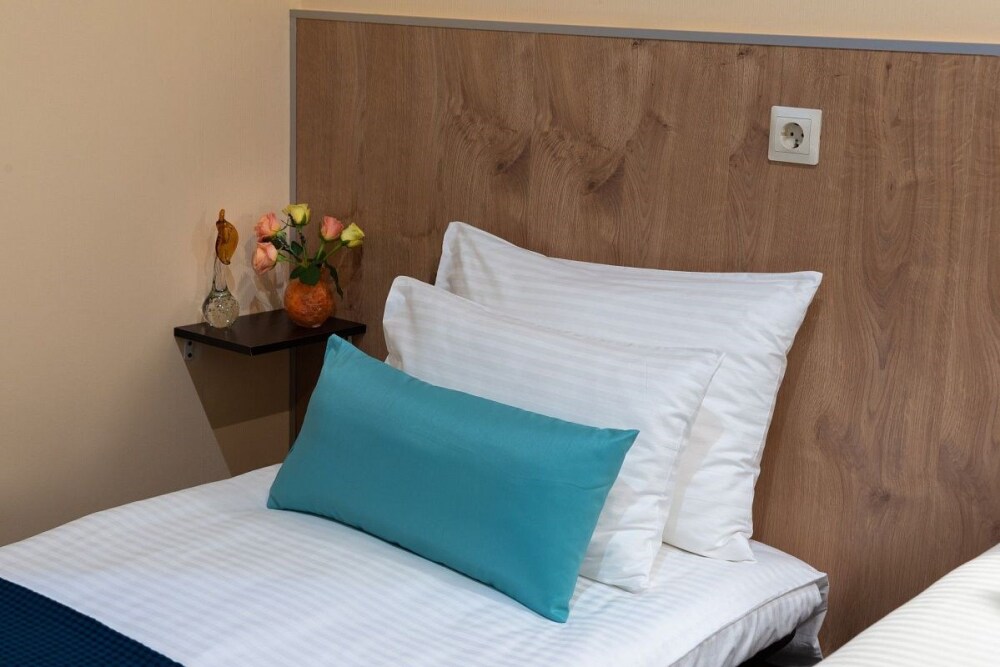 При размещении 1-2 человек на выбор предлагается либо двуспальная кровать, либо 2 раздельные. Есть возможность установки дополнительного места (евро-раскладушки) для размещения третьего человека. Для маленьких детей есть возможность поставить детскую кроватку-манеж.