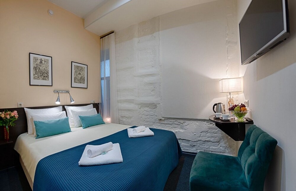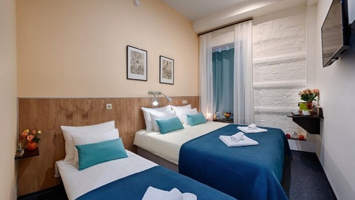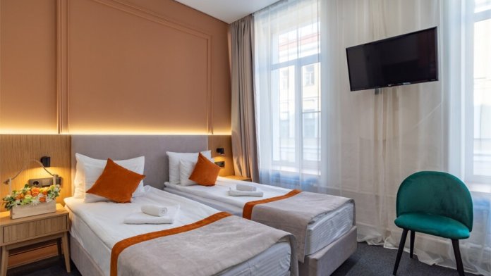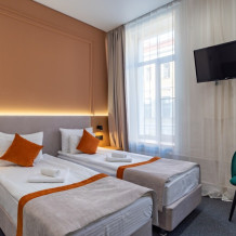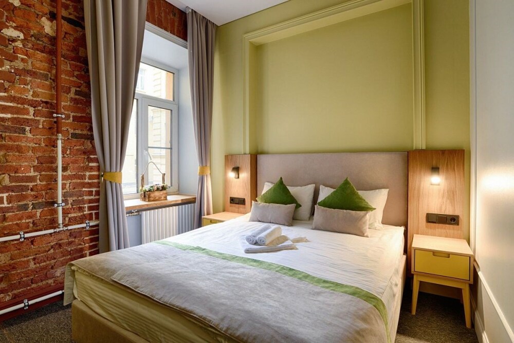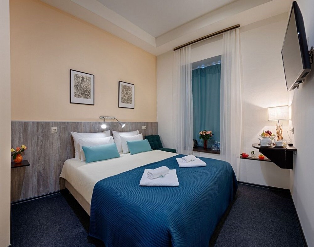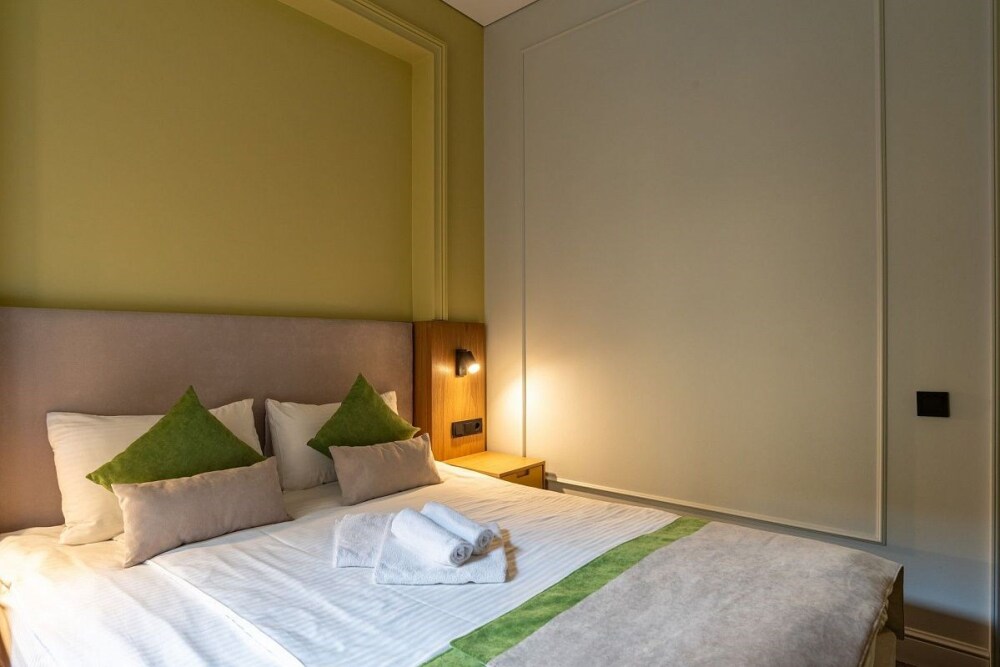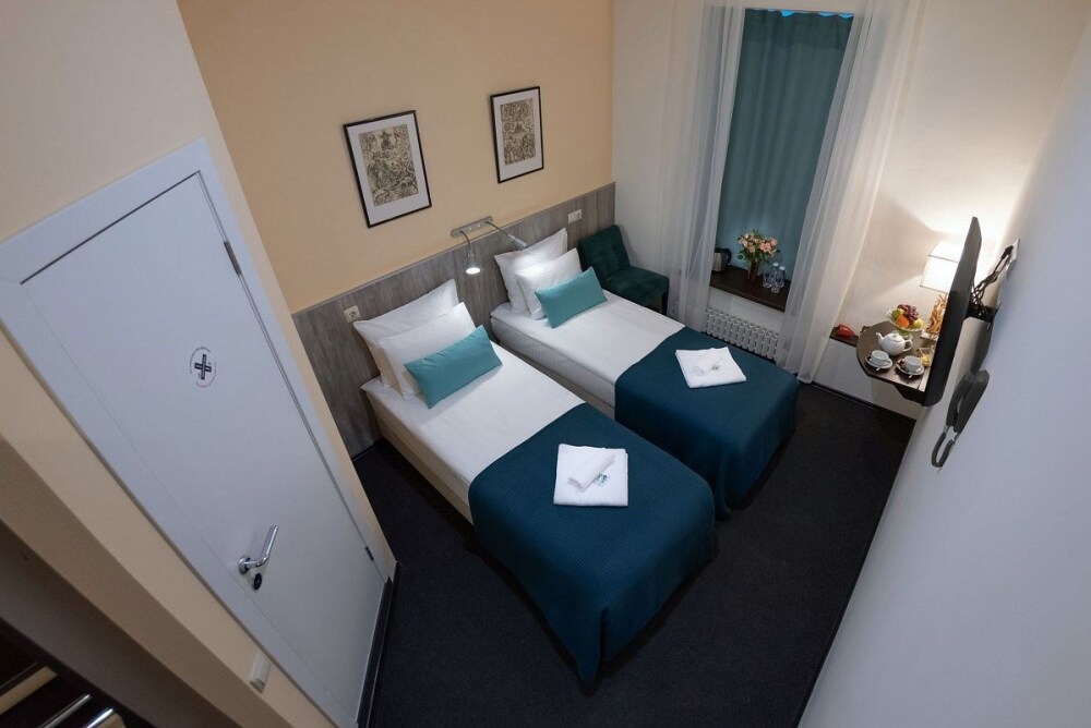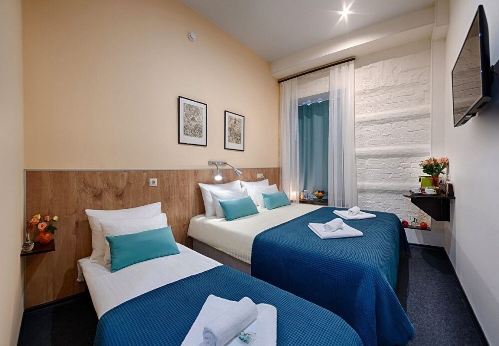 При размещении 1-2 человек на выбор предлагается либо двуспальная кровать, либо 2 раздельные. Есть возможность установки дополнительного места (евро-раскладушки) для размещения третьего человека. Для маленьких детей есть возможность поставить детскую кроватку-манеж.