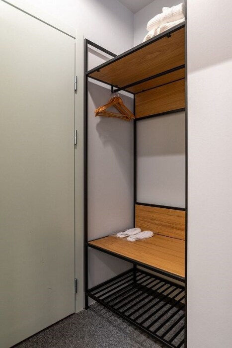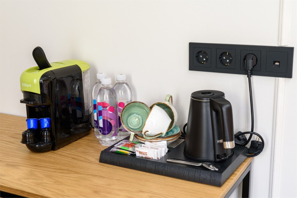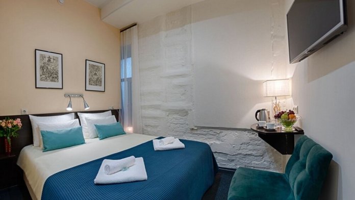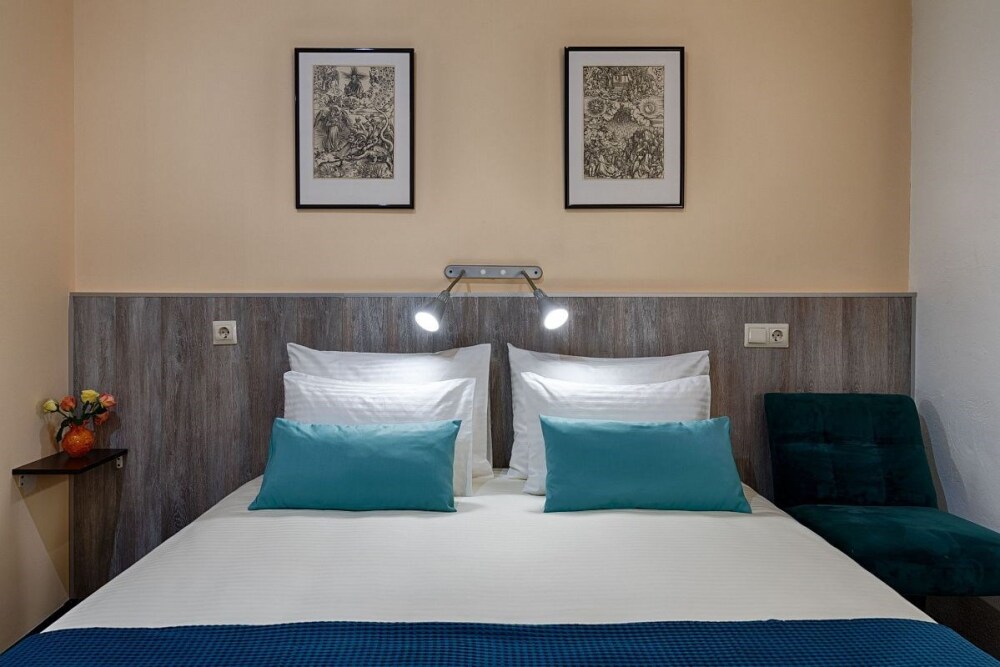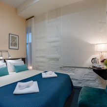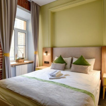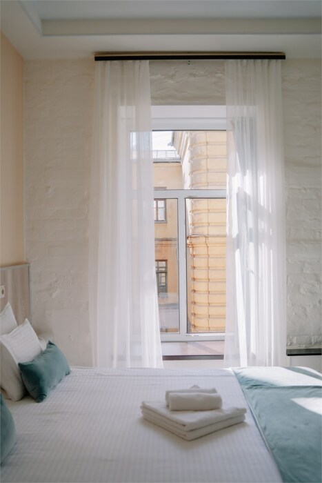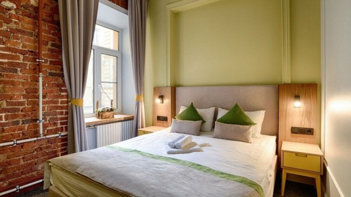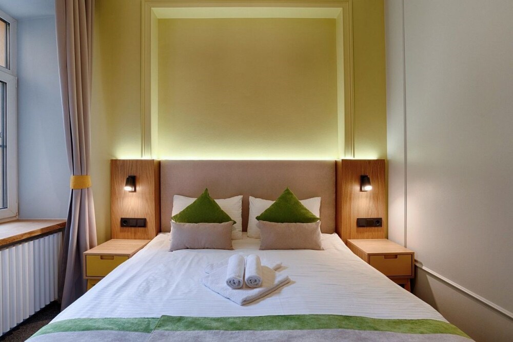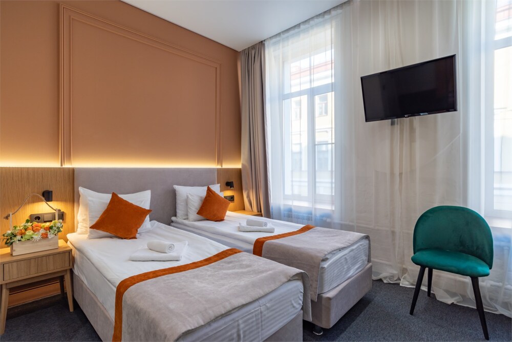 При размещении 1-2 человек на выбор предлагается либо двуспальная кровать, либо 2 раздельные. Есть возможность установки дополнительного места (евро-раскладушки) для размещения третьего человека. Для маленьких детей есть возможность поставить детскую кроватку-манеж.