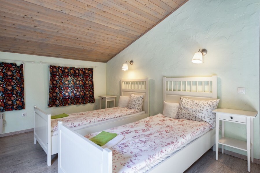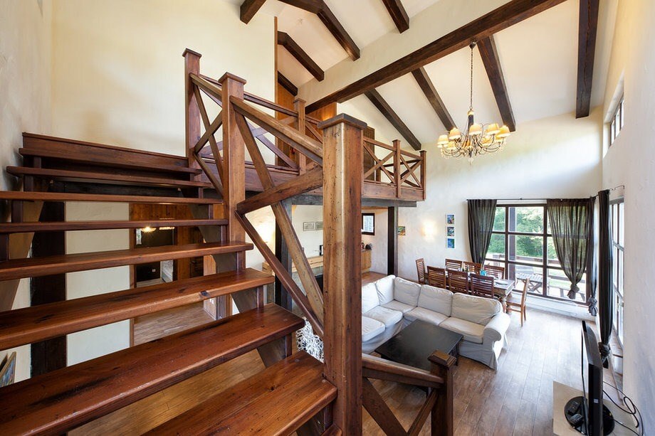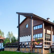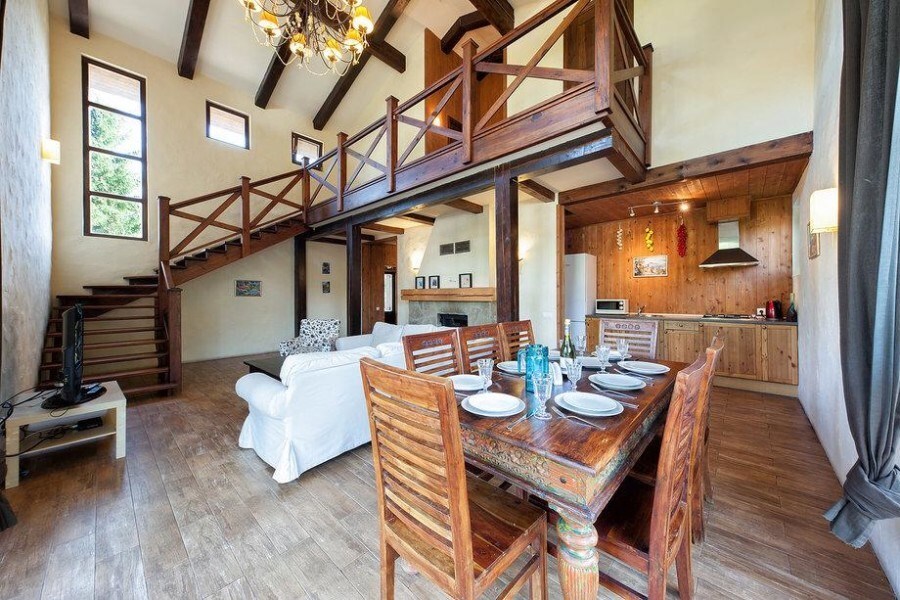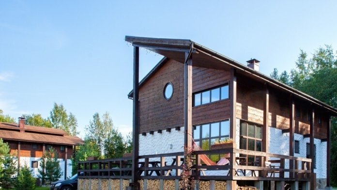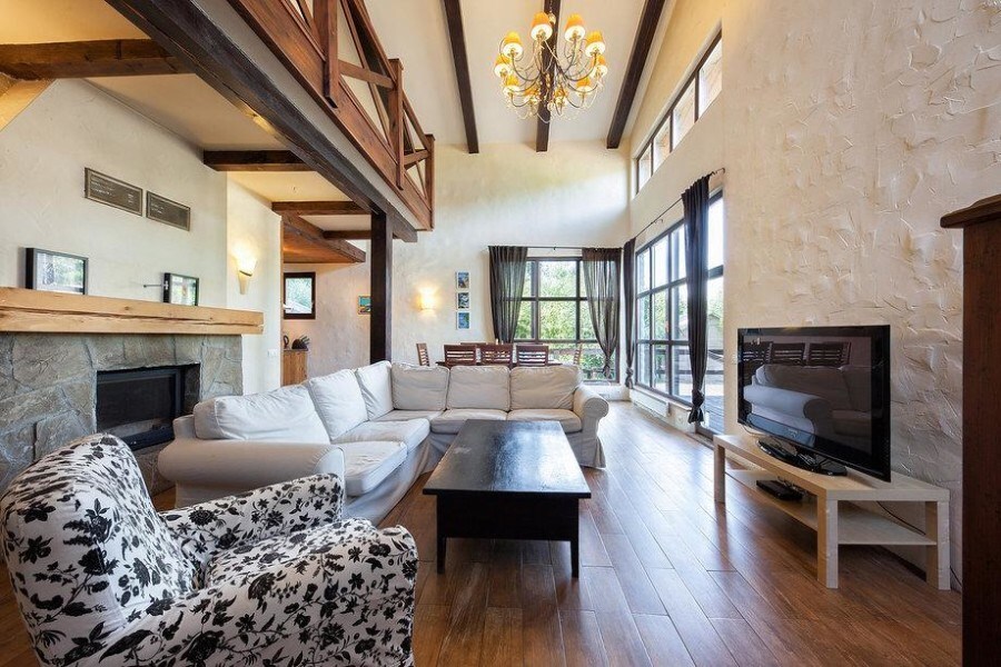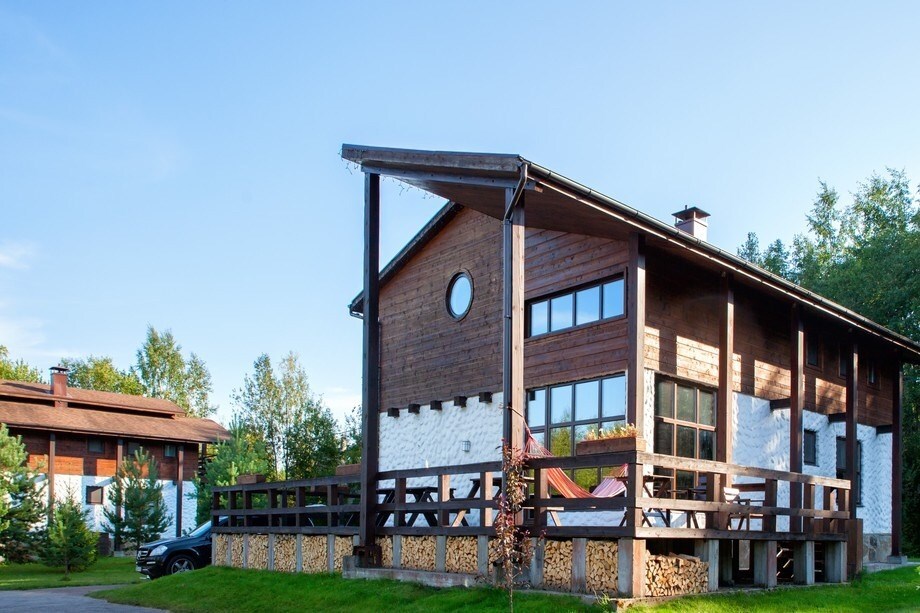 Каждый из 9-ти коттеджей нашего комплекса имеет площадь 200 м2, а также летнюю террасу 70 м с деревянной мебелью и зону барбекю. Панорамные окна просторной 50-ти м гостиной с видом на лес и озеро позволят насладиться единением с природой, не выходя из дома. А тихо потрескивающие поленья в камине сделают Ваш отдых еще более приятным, романтичным и незабываемым. При длительном проживании предоставляются: стиральная машина, утюг, гладильная доска, сушилка для белья, по запросу бесплатно детская кроватка-манежик и стульчик для кормления. Внешняя открытая терраса (70 м2) с деревянной садовой мебелью, видом на озеро и лес, на которой можно дополнительно установить столы для проведения Вашего мероприятия (до 20 человек). Балкон.