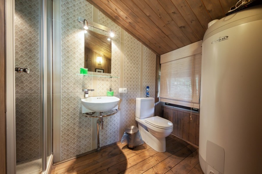 2 уютные душевые комнаты оборудованы швейцарской сантехникой и декорированы мраморной плиткой и деревом, на 1 и 2 этажах. Бесперебойную подачу горячей воды для всех помещений обеспечивает норвежский водонагреватель Oso 300 л.