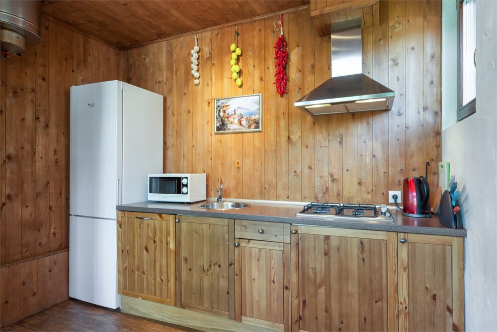 Кухня: камин на дровах, плазменная панель 102 см, дизайнерская мебель, посудомоечная машина Electrolux на 12 комплектов посуды, 4-х конфорочная газовая варочная поверхность, вытяжка и вся необходимая кухонная посуда. Во всех коттеджах установлены тёплые полы в санузлах и гостиных.