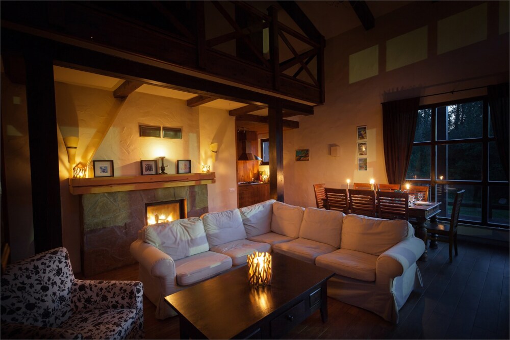 Кухня: камин на дровах, плазменная панель 102 см, дизайнерская мебель, посудомоечная машина Electrolux на 12 комплектов посуды, 4-х конфорочная газовая варочная поверхность, вытяжка и вся необходимая кухонная посуда. Во всех коттеджах установлены тёплые полы в санузлах и гостиных. При необходимости, по запросу, можно поставить 2 дополнительных спальных места.