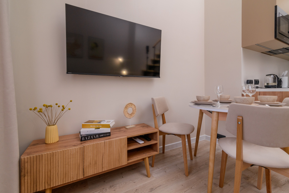 Большая зона отдыха с раскладным диваном, Smart TV и обеденным столом.