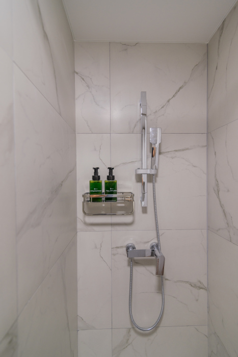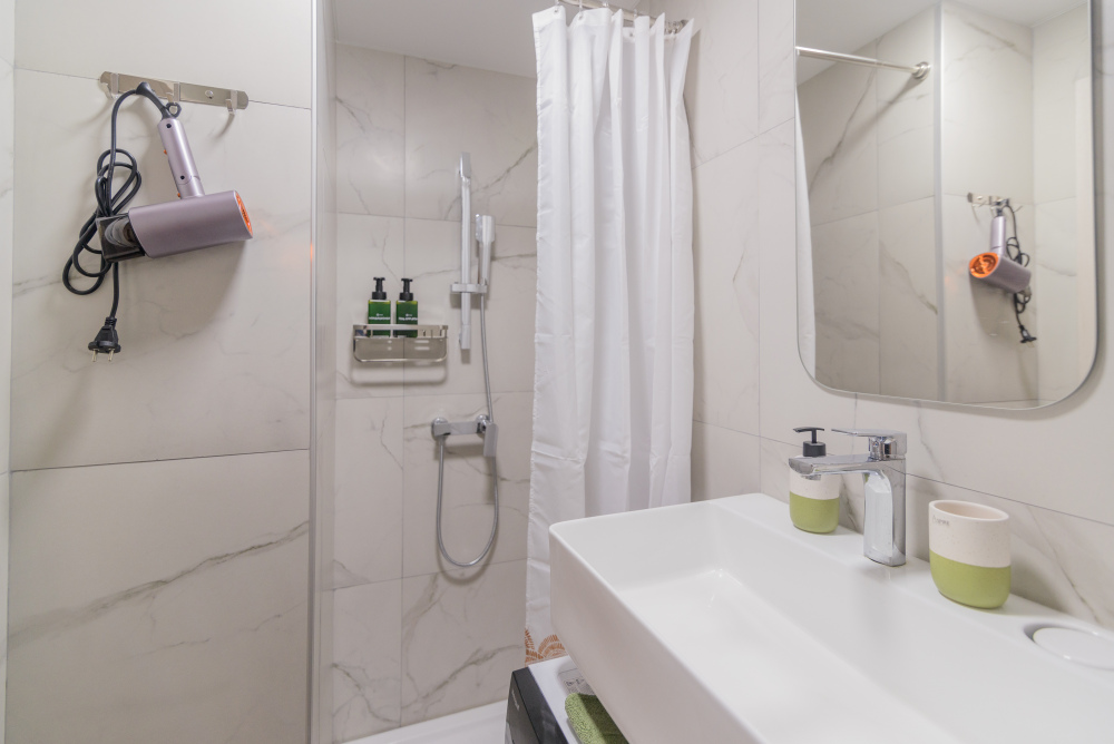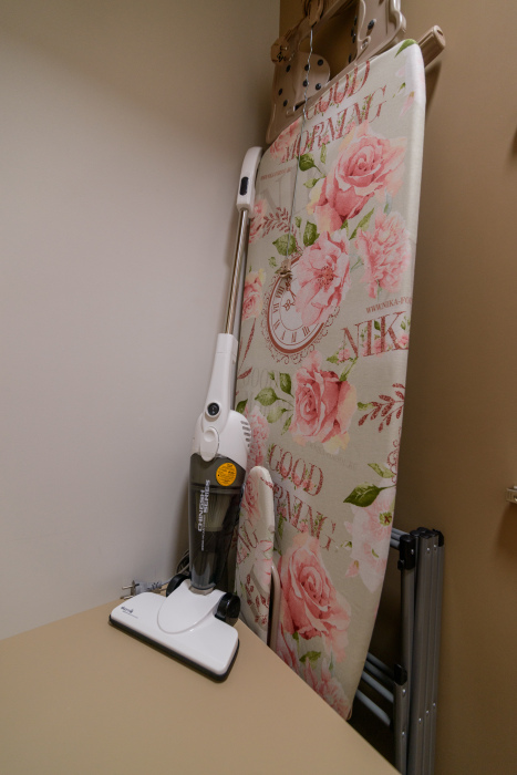 Санузел включает душевую кабину, туалет, стиральную машину, электрическую и дополнительную сушилку для белья.